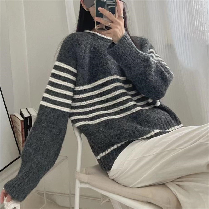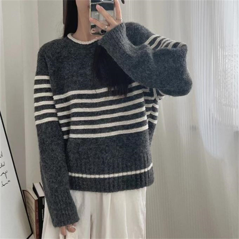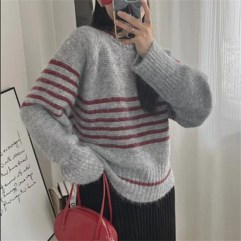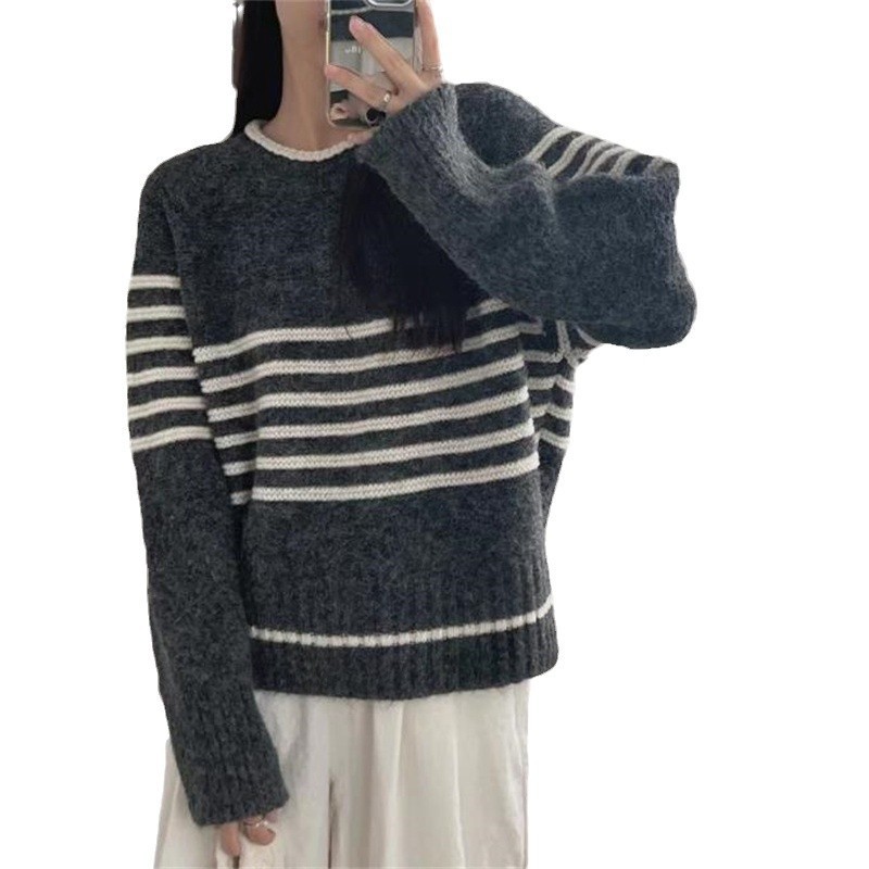 Autumn And Winter Korean Retro Contrast Color Stripes Idle Style Crew Neck Pullover Sweater