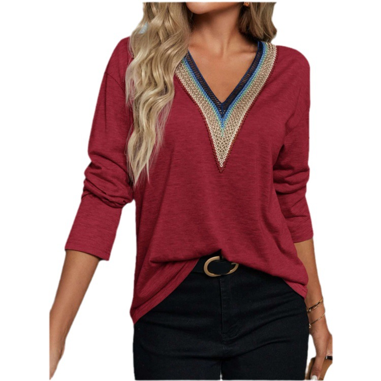 Autumn And Winter Lace Spliced V-neck Loose Long Sleeve