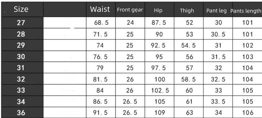 Size: 27 (waist 2 feet),28 (waist 2 feet 1),29 (waist 2 feet 2),30 (waist 2 feet 3),31 (waist circumference 2 feet 4),32 (waist circumference 2 feet 5),33 (waist circumference 2 feet 6),34 (waist circumference 2 feet 7),36 (waist circumference 2 feet 8)