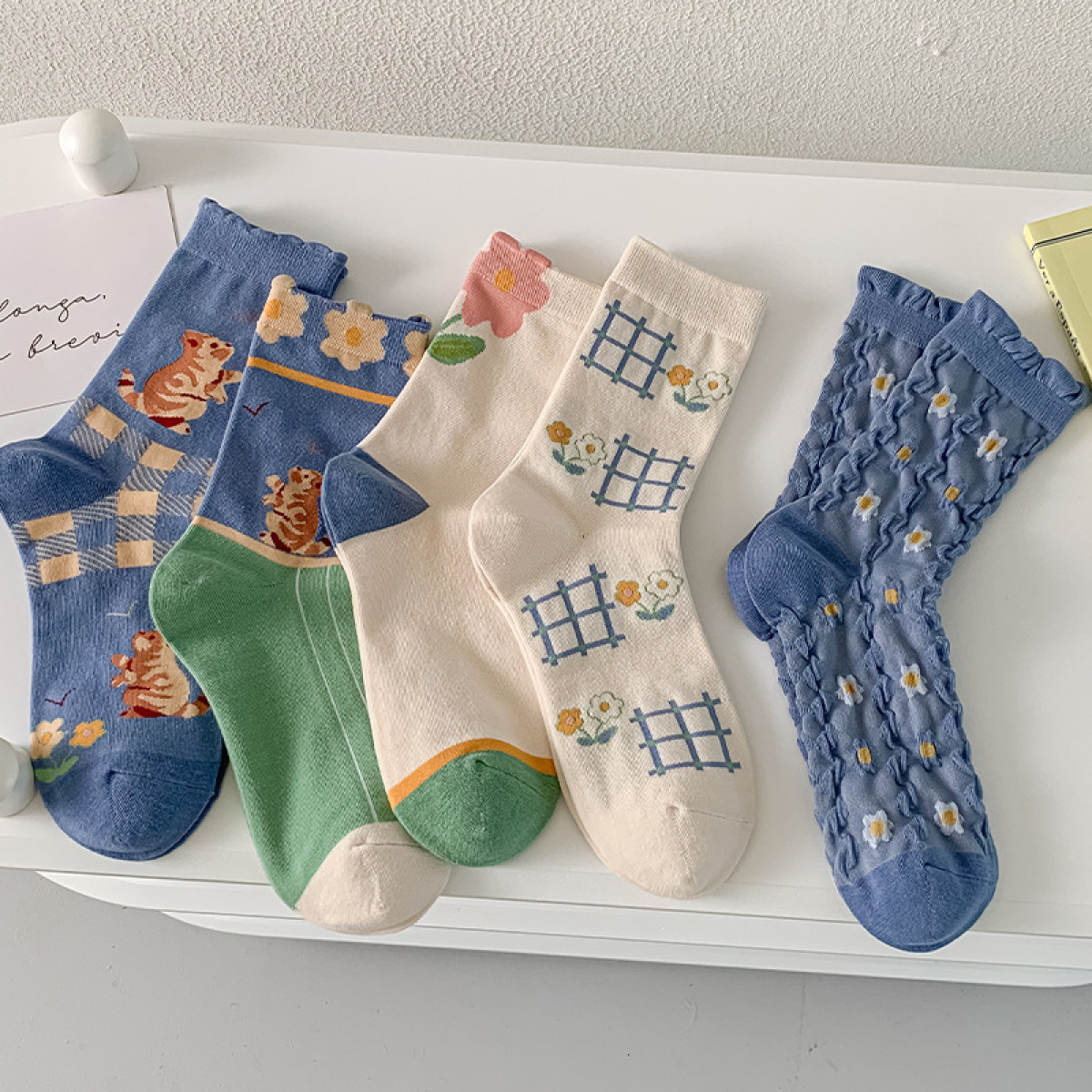 Color: blue cat, blue flowers, green stripes, beige plaid, beige flowers