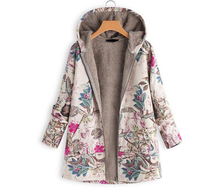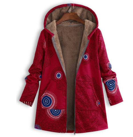 Autumn And Winter New Women's Vintage Warm Printing Pocket Thickened Zipper Hoodie