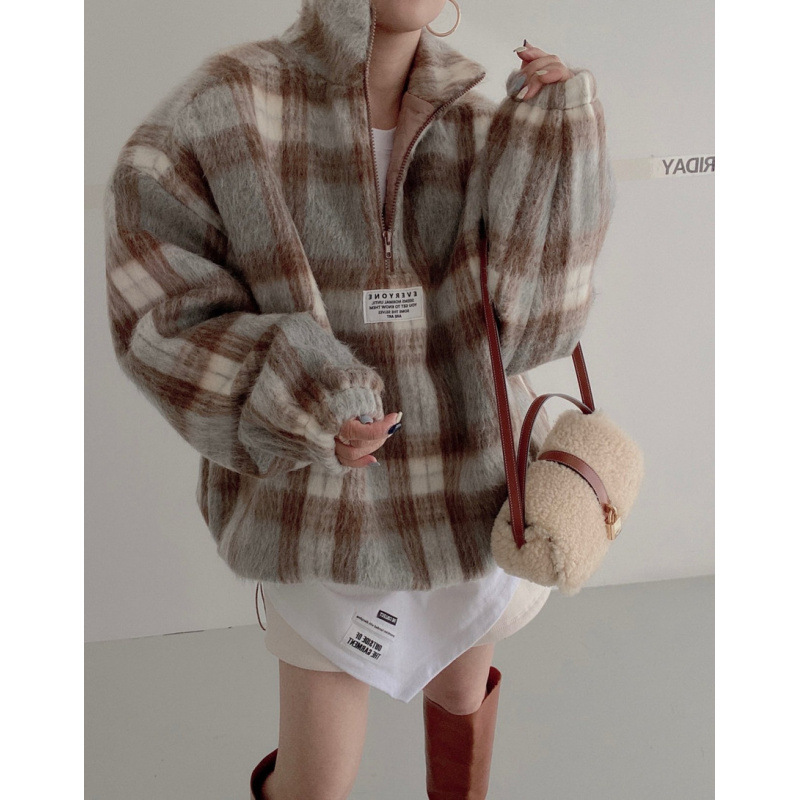 Autumn And Winter Niche Temperament Stand Collar Plaid Woolen Sweater For Women
