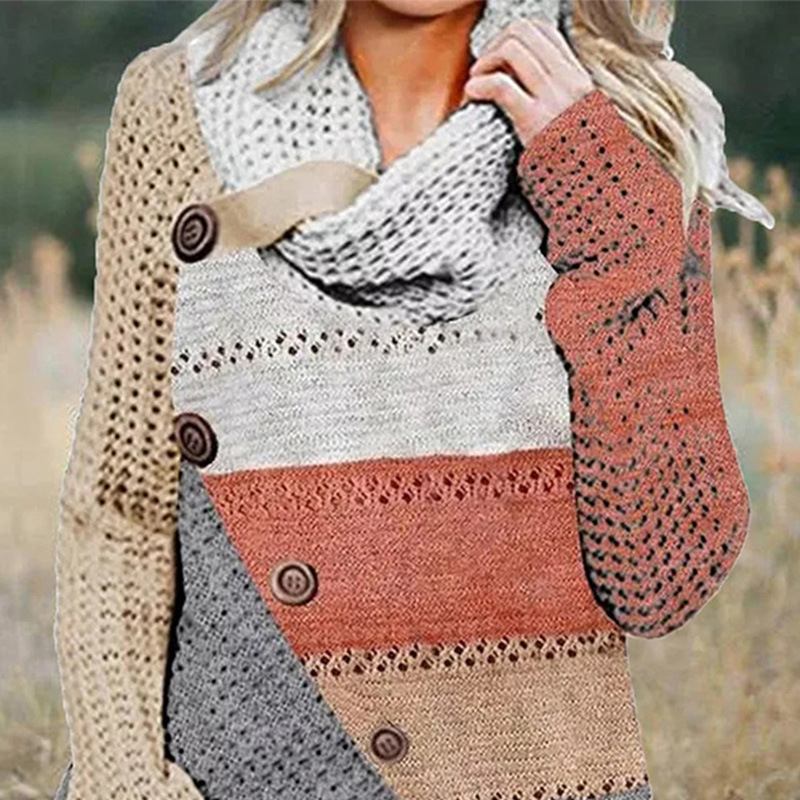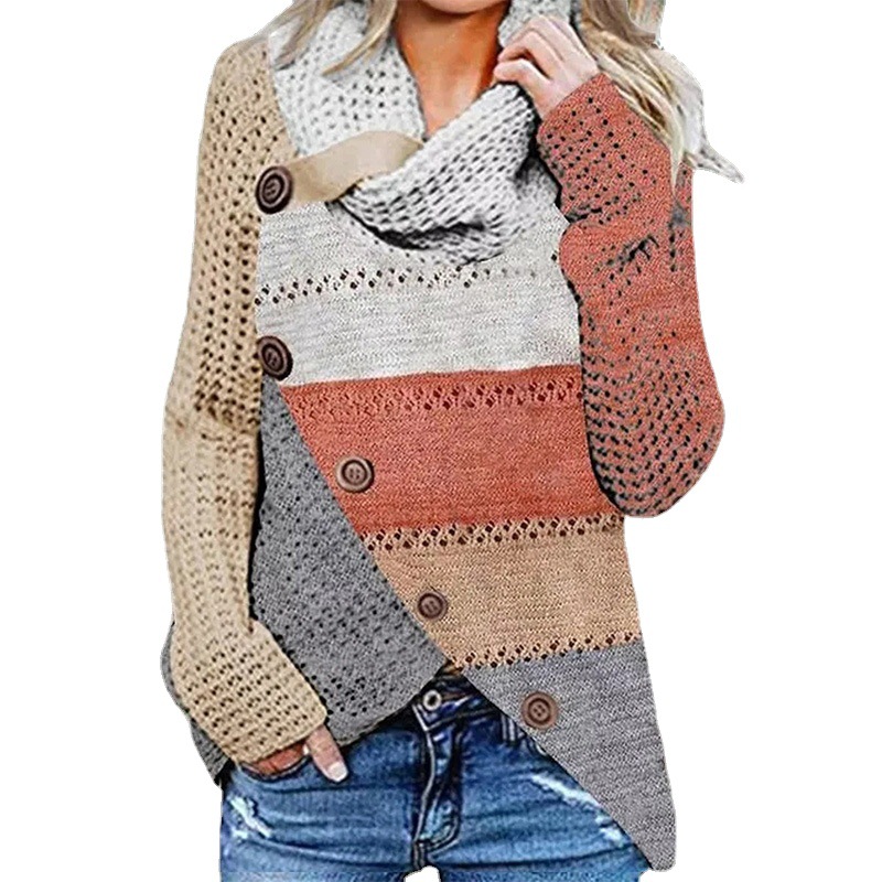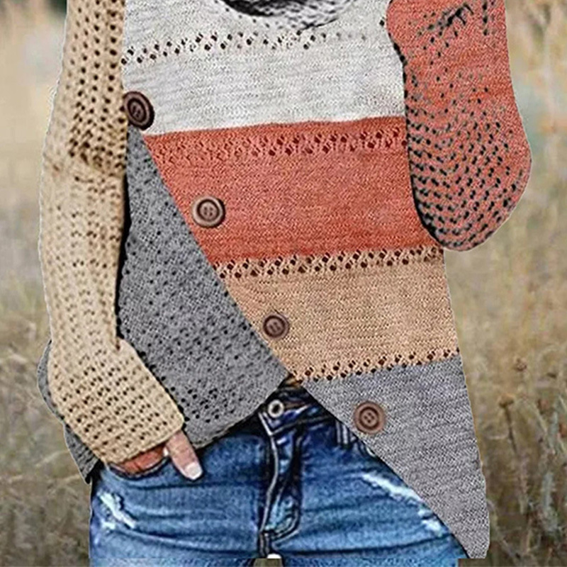 Autumn And Winter Women's Clothing Mixed Color Stripe Irregular Sweater Button Sweater