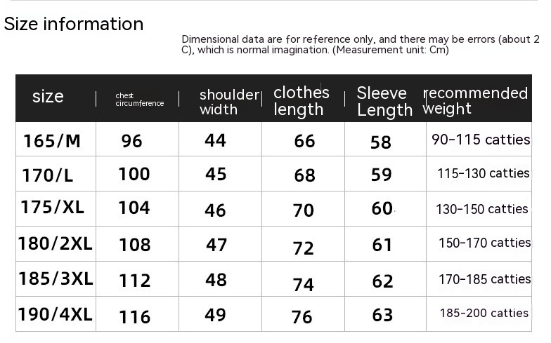 Size: M/105,L/170,XL/175,XXL/180,XXXL/185,4XL/190