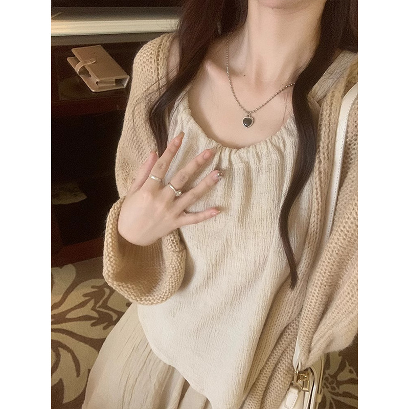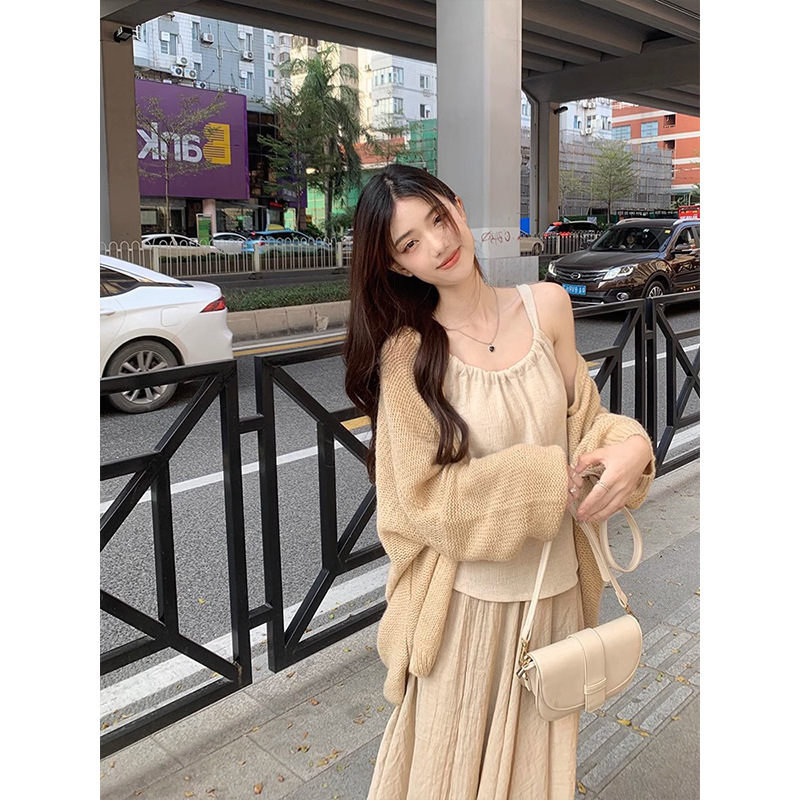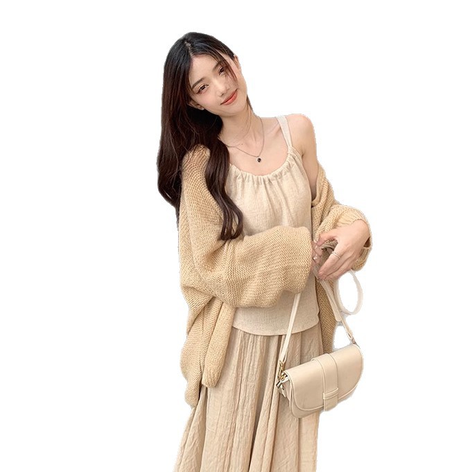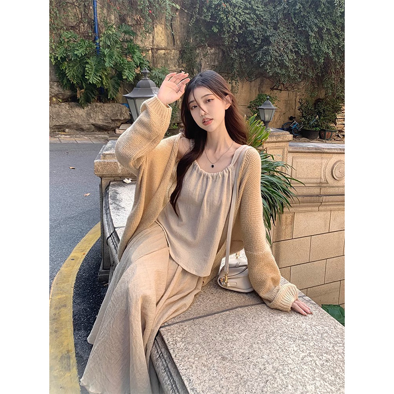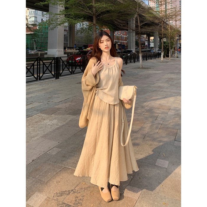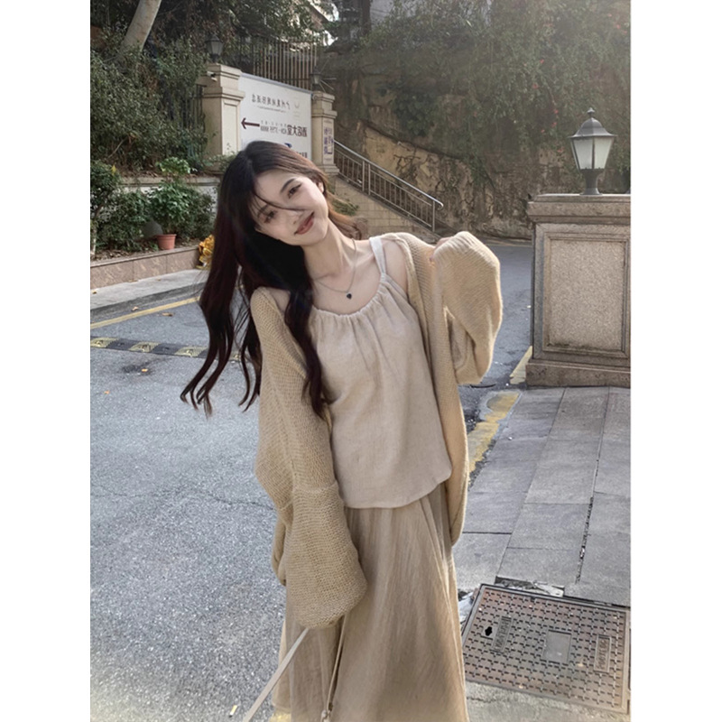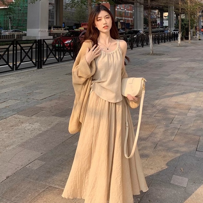 Color: Cardigan, beige skirt, suit