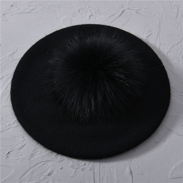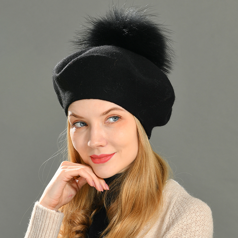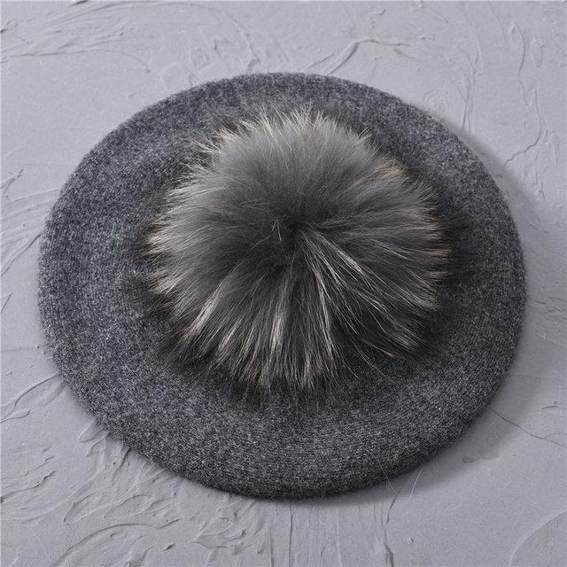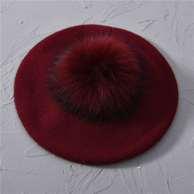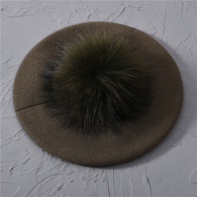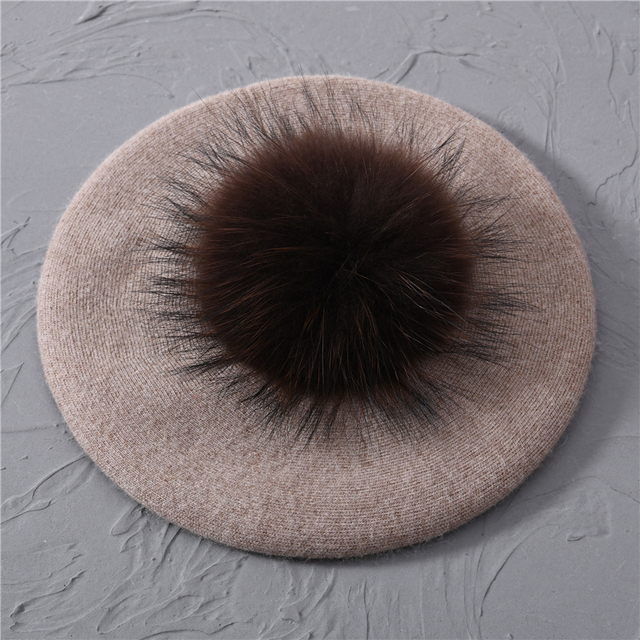 Autumn Winter Berets Hat Women Casual Knitted Wool Beret with Real Raccoon Fur Pom Pom Ladies Angola Cashmere Beret Hat Female