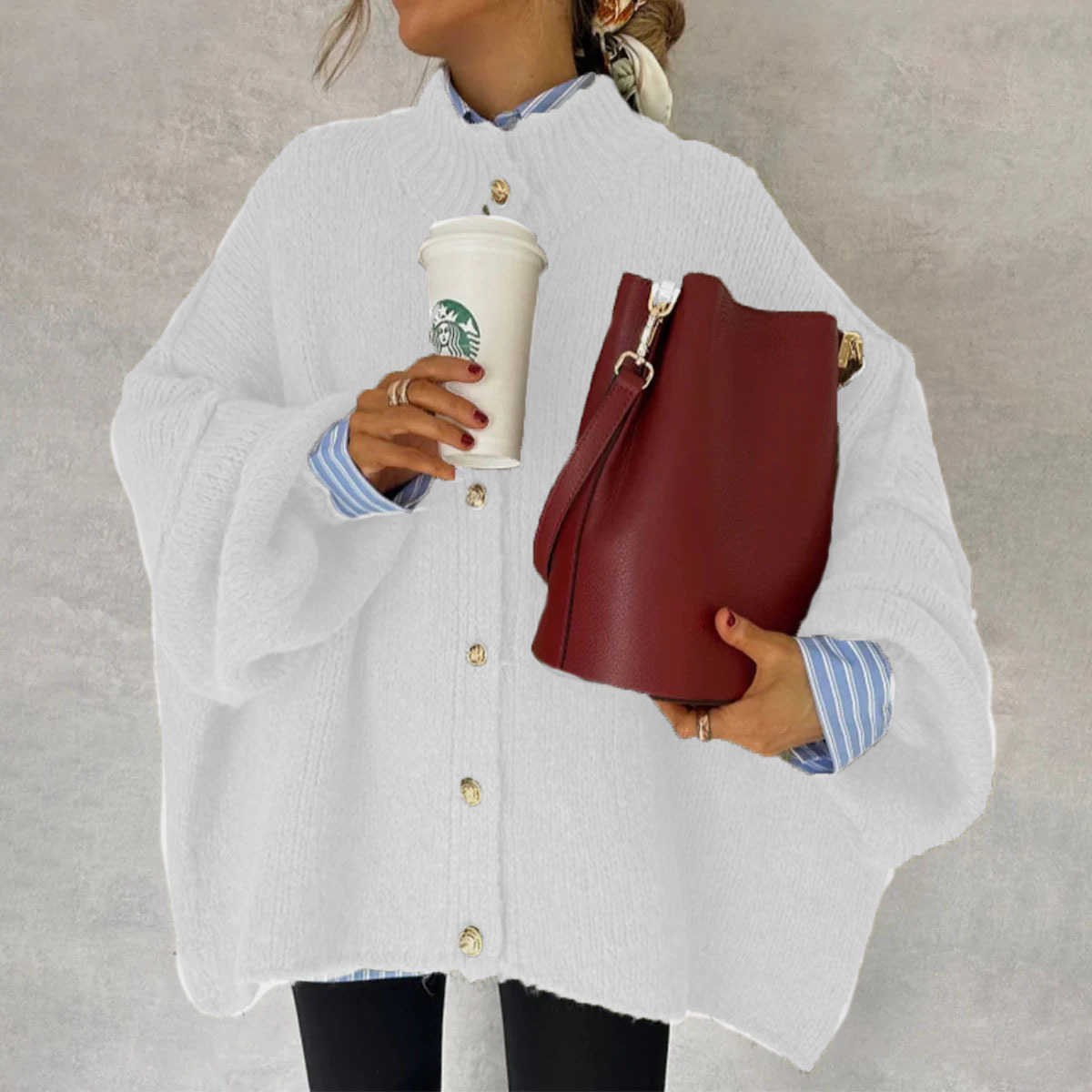 Autumn Winter Solid-Color Casual Knitted Cardigan With Buttons And Oversized Sleeves