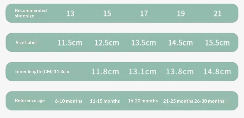 Sizes: 13 (inner length 11.5 cm), 15 (inner length 12.5 cm), 17 (inner length 13.5 cm), 19 (inner length 14.58 cm), 21 (inner length 15.5 cm)