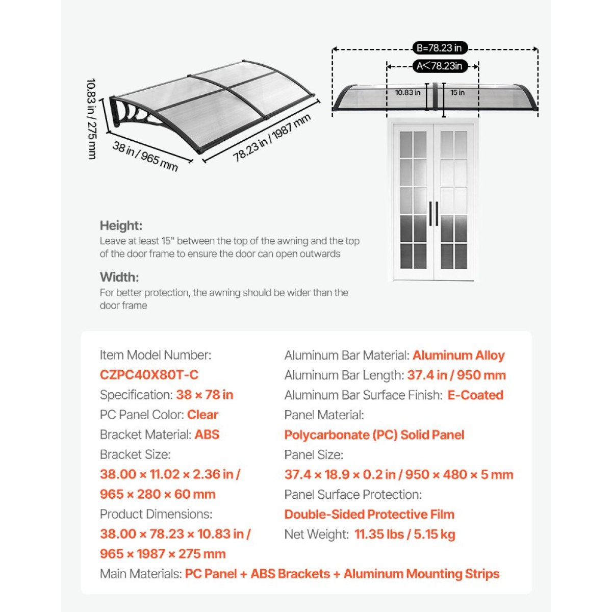 Strong & Durable Construction: Made with high-transparency polycarbonate panels & reinforced ABS brackets, this awning for door entrance offers excellent load bearing. It's shock-resistant, flame-retardant, noise-reducing, and adds a clean, modern look to your exterior