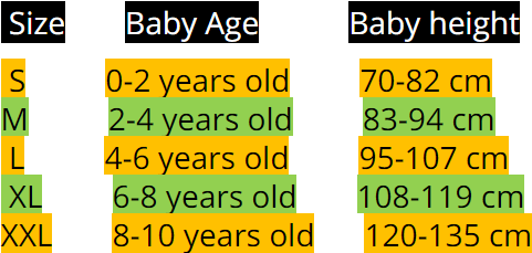Suitable height: S (1-2 years old), M (2-4 years old), L (4-6 years old), XL (6-8 years old), XXL (8-10 years old), XS (0-1 years old)