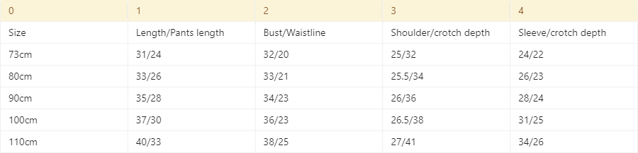 Suitable height: clothing label 73, clothing label 80, clothing label 90, clothing label 100, clothing label 110