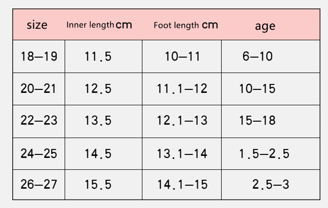 Size: 18-19 [11.5CM], 20-21 [12.5CM], 22-23 [13.5CM], 24-25 [14.5], 36-27 [15.5CM]