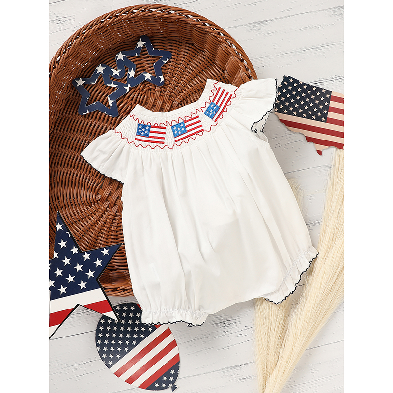 Celebrate Independence Day in ultimate cuteness with this festive bubble romper! Designed for holiday photos and comfy playtime, this smocked bodysuit features charming American flag embroidery and a playful bubble silhouette that’s as sweet as it is stylish.