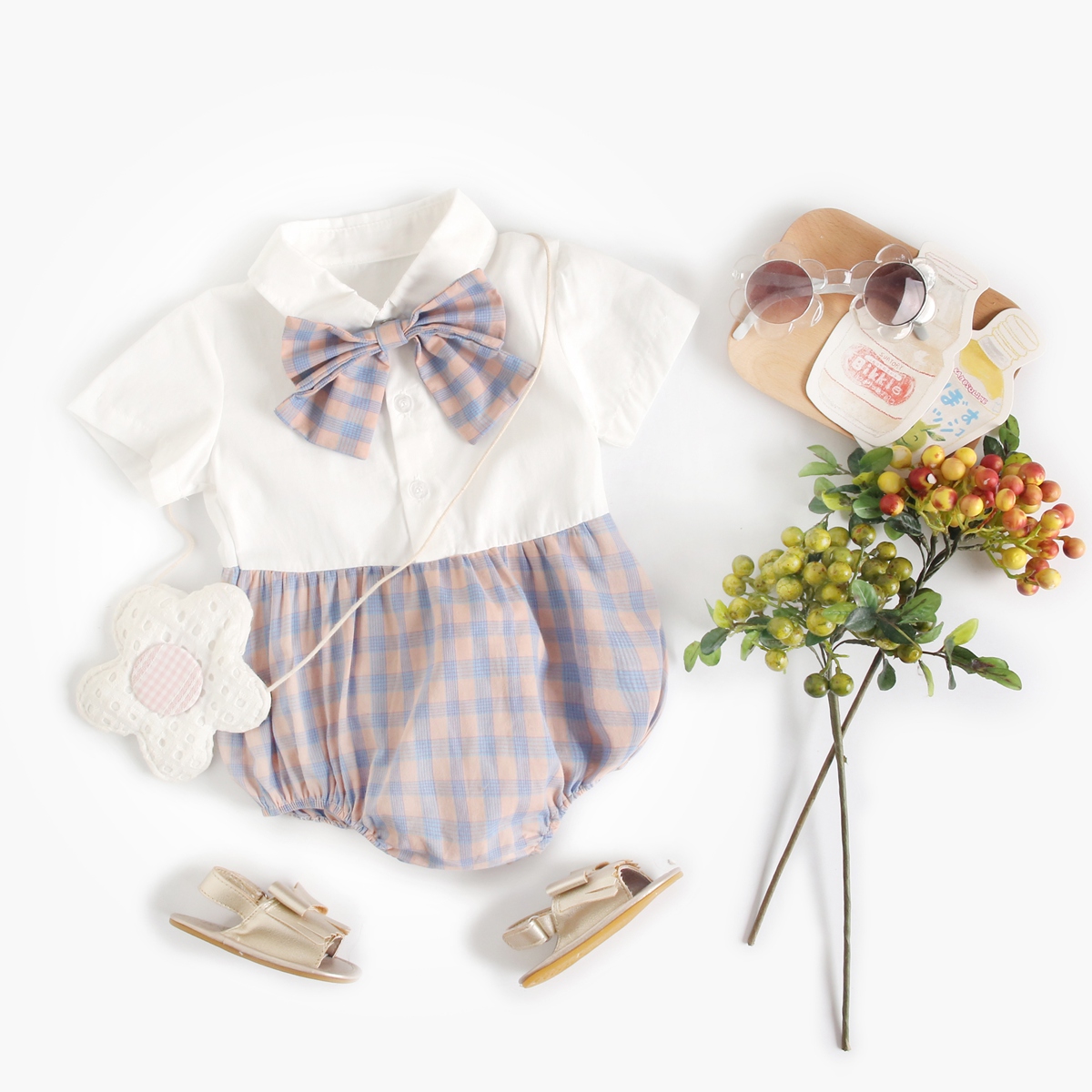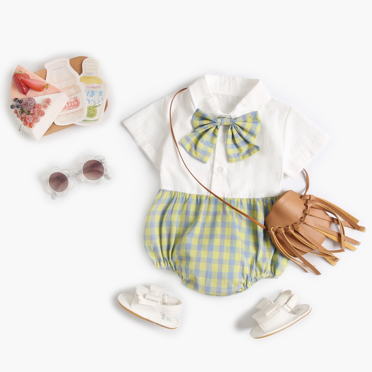 Color: BRS1094-GR green grid JK short-sleeved romper, BRS1094-PK pink grid JK short-sleeved romper
