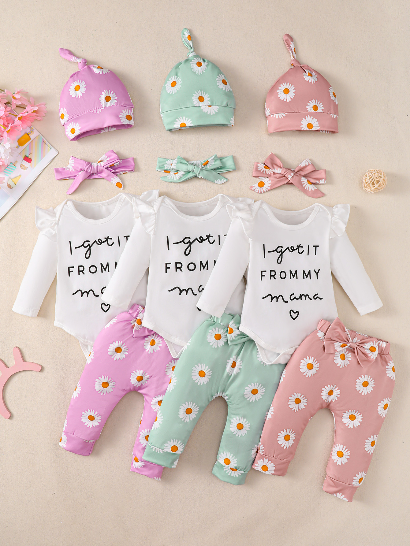 Color: pink, green, light purple