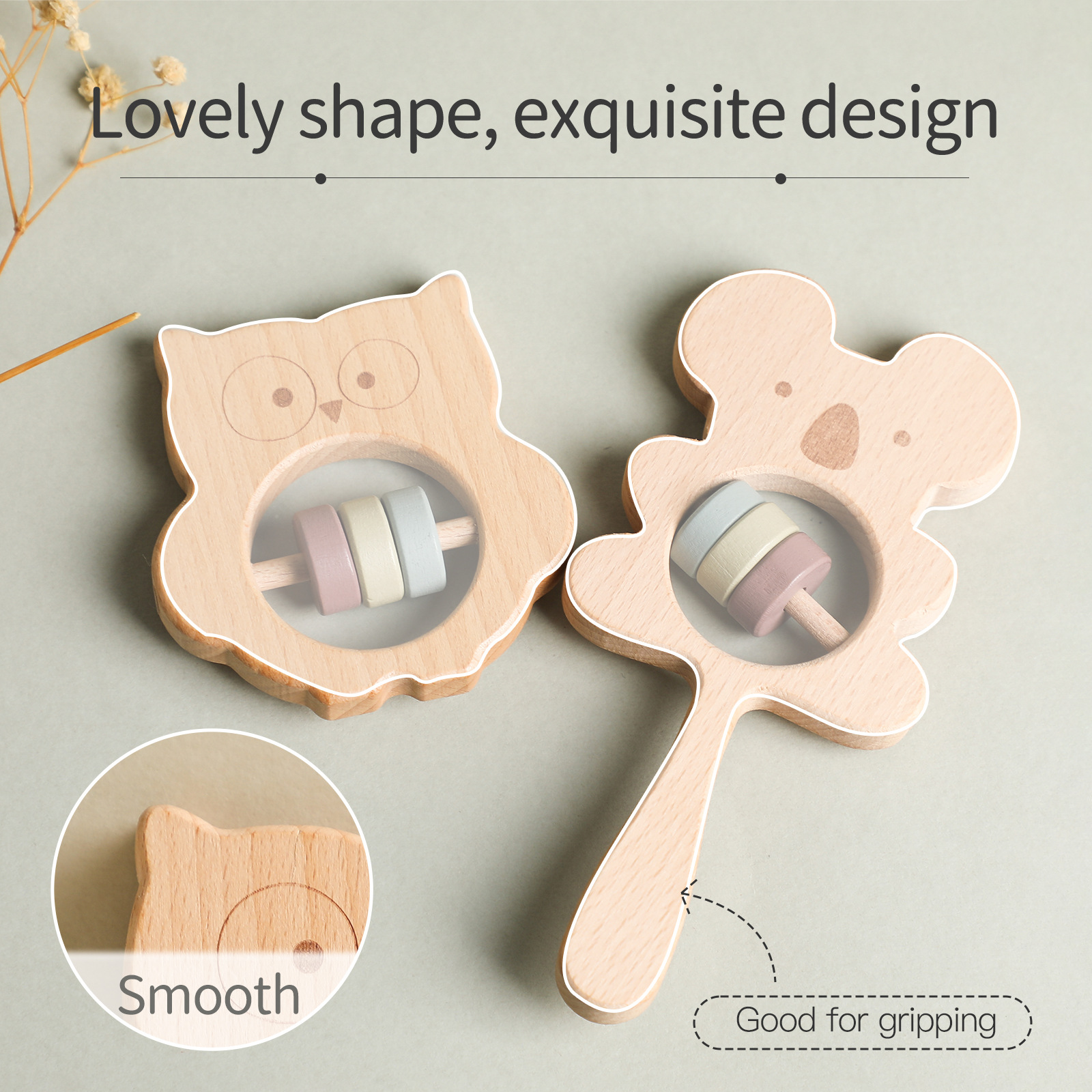 Color: Koala style, owl style, pink bell rabbit, Brown Bell rattle, white bell lion, gray Bell lion, Rabbit wooden ring, koala wooden ring, Lion wooden ring, Beech semicircle rattle grinding machine