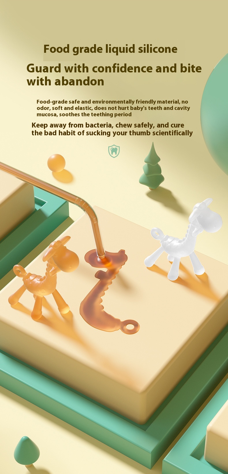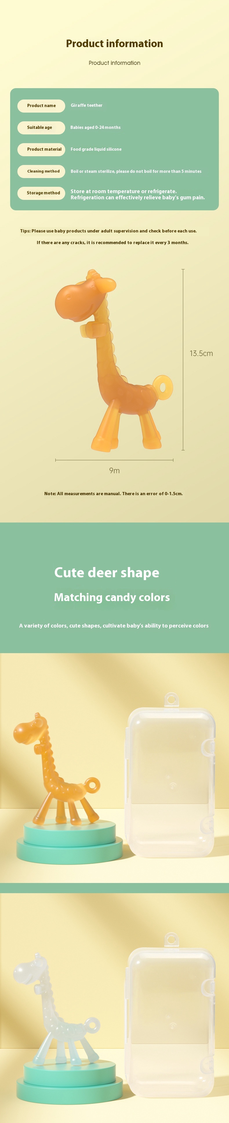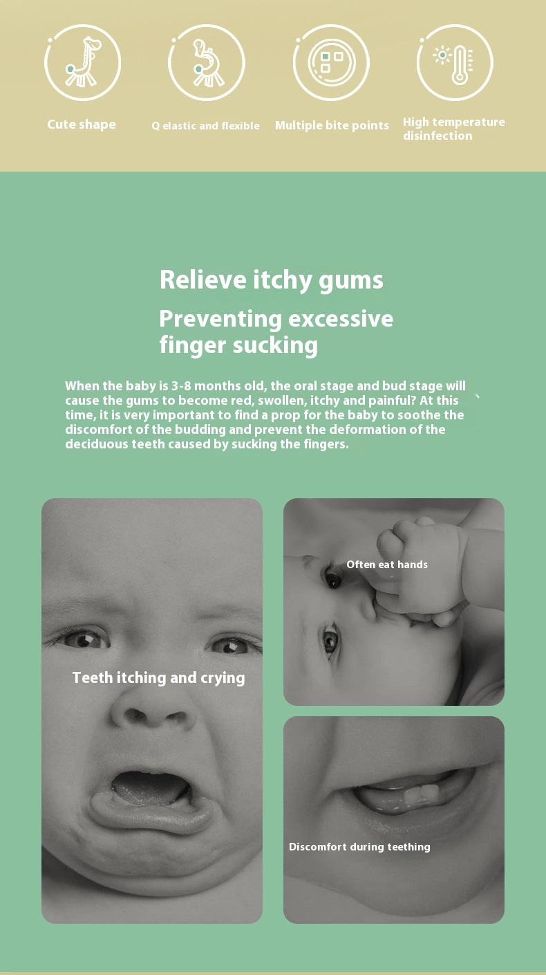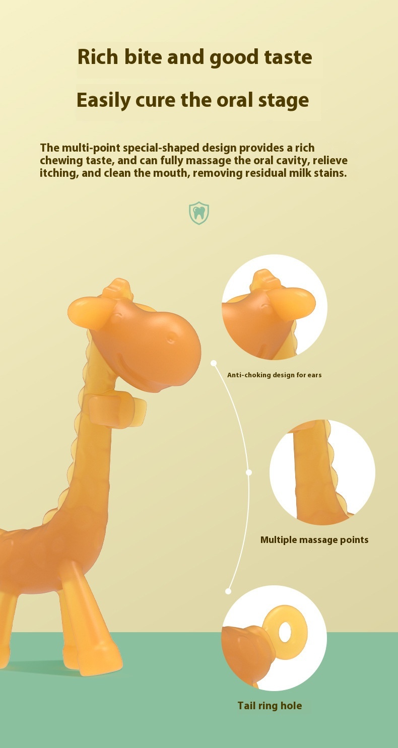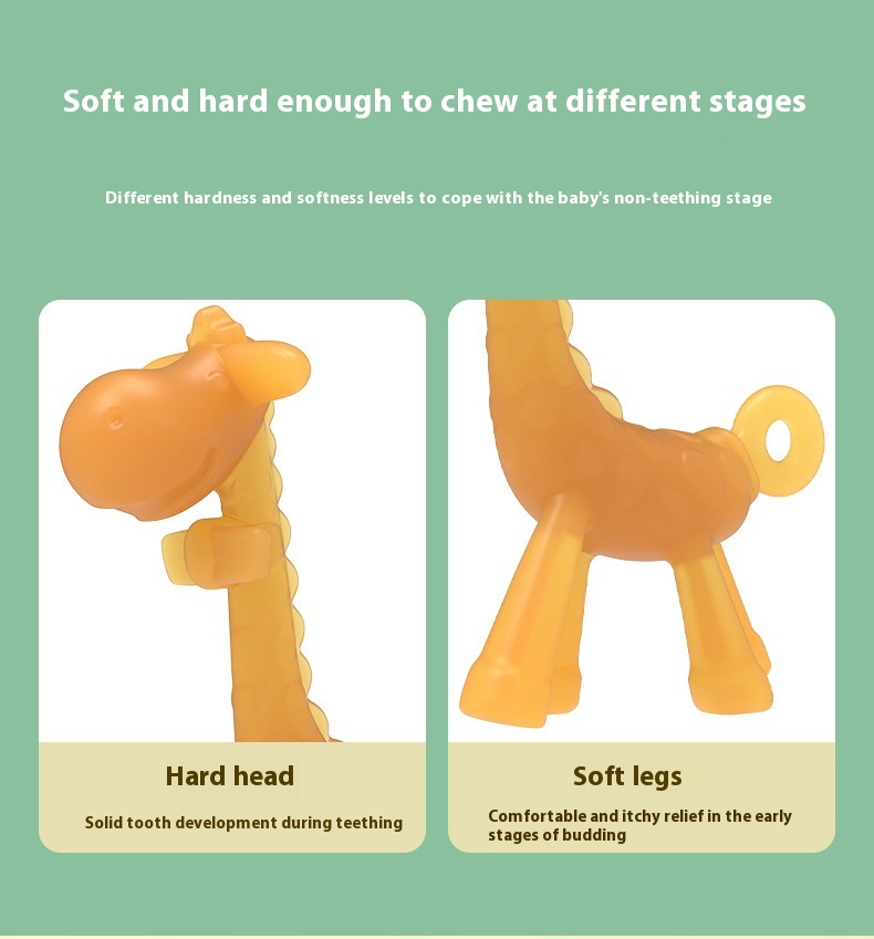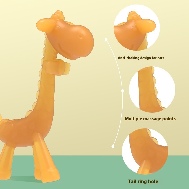 Features: soft and safe, relieve teething discomfort, giraffe shape design, massage gums, exercise grip, calm mood, strong toughness, resistant to pulling