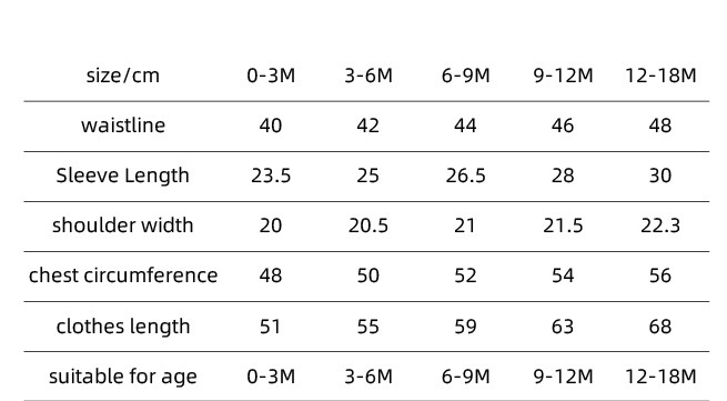 Size: suitable for height 0-3M, 3-6M, 6-9M, 9-12M, 12-18M