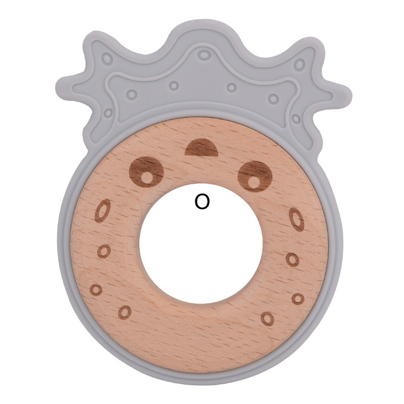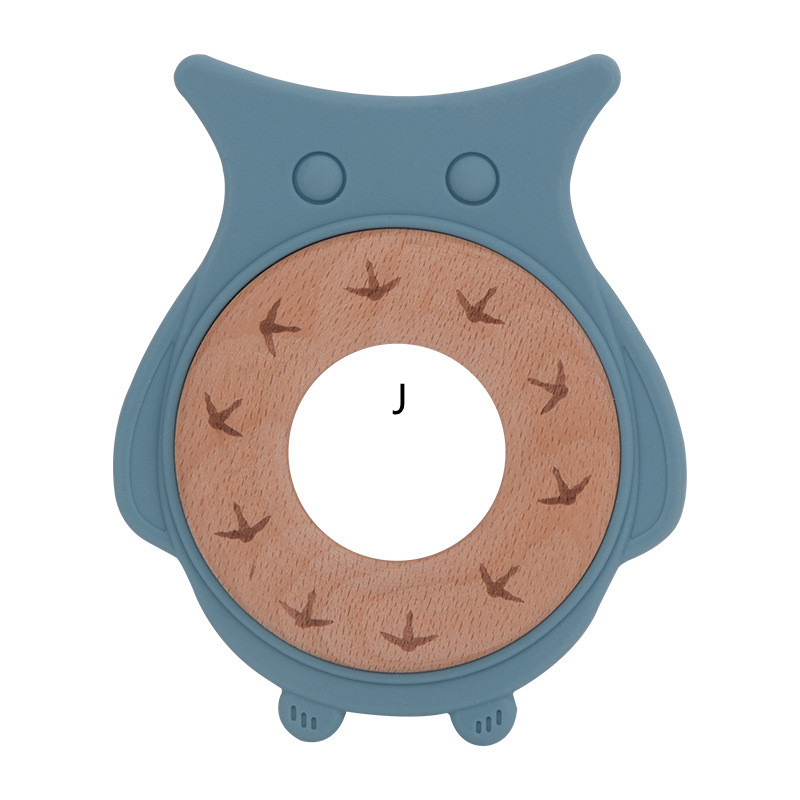 J: Smoke blue owl wooden ring teether,