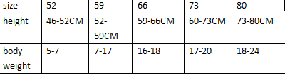 52cm (recommended height 0-1 months), 59cm (recommended height 55-59cm), 66cm (recommended height 59-66cm), 73cm (recommended height 66-73cm), 80cm (recommended height 73-80cm)