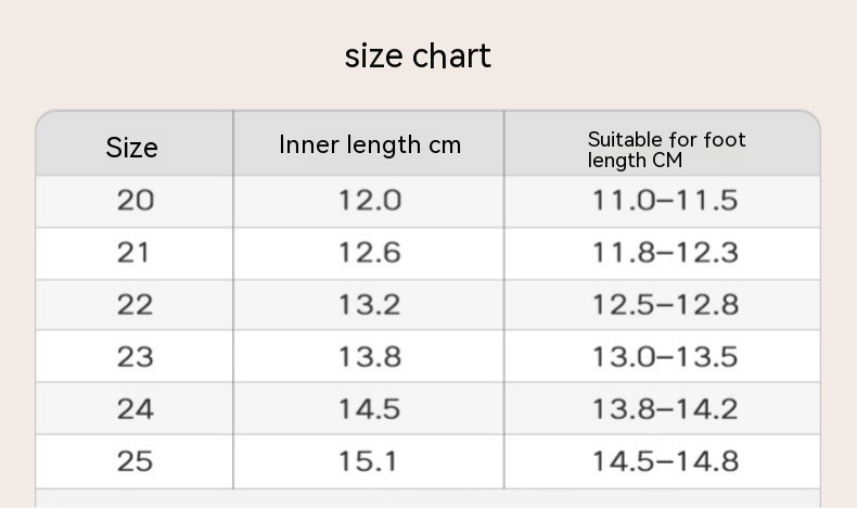 Size: size 20 insole length 12cm, size 21 insole length cm, size 22 insole length cm, size 23 insole length cm, size 24 insole length cm, size 25 insole length 15.1cm