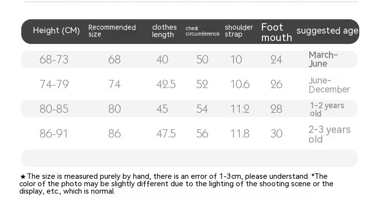 Suitable height: 68(3-6 months),74(6-12 months),80(1-2 years old),86(2-3 years old)