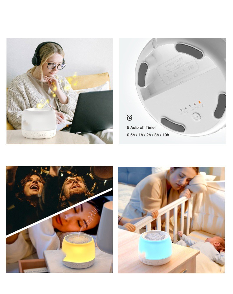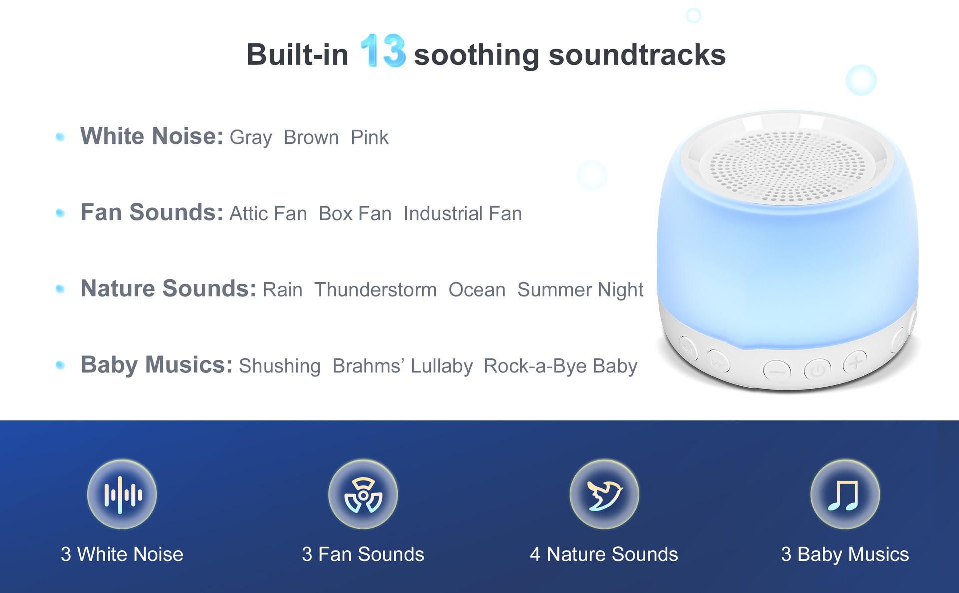 White noise machine *1, AC adapter +USB-C charging cable "1, English instruction *1, environmental protection PE bag *1, color box 1.