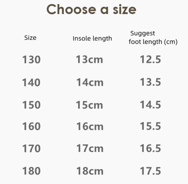 Size: 130/ length 13cm/ about 1 year old, 140/ length 14cm about 1.5-2 years old, 150/ length 15cm/ about 2-2.5 years old, 160/ length 16cm/ about 3-3.5 years old, 170/ length 17cm/ about 4-4.5 years old, 180.