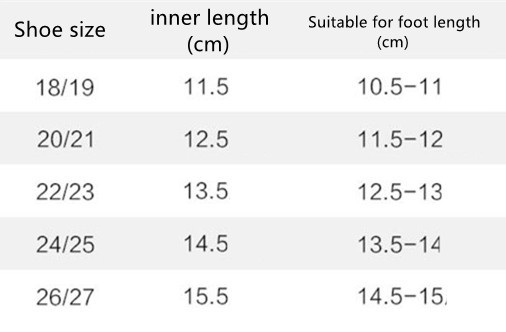 Size: inner length 11.5 cm18/19, inner length 12.5 cm20/21, inner length 13.5 cm22/23, inner length 14.5 cm24/25, inner length 15.5 cm26/27