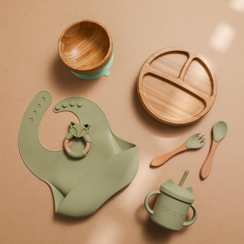 Wooden disc x1, bib x1, spoon x1, fork x1, cup x1, straw x1, bowl x1