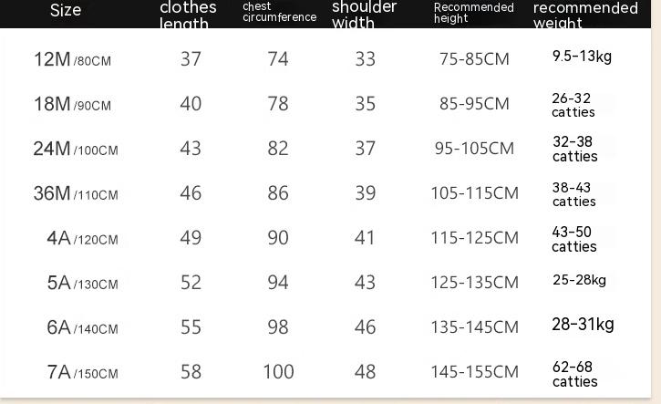 Size: 12M (80cm) 18M (90cm) 24M (100cm) 36M (110cm) 4A (120cm) 5A (130cm) 6A (140cm) 7A (150cm)