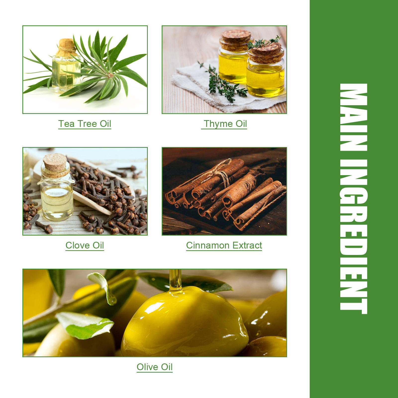 Ingredients: tea tree oil, thyme oil, clove oil, cinnamon extract, olive oil