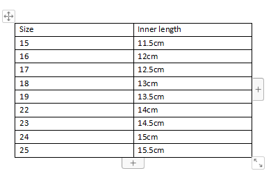Size: 15: inner length 11.5cm, 16: inner length 12cm, 17: inner length 12.5cm, 18: inner length 13cm, 19: inner length 13.5cm, 22: inner length 14cm, 23: inner length 14.5cm, 24: inner length 15cm, 25: inner length 15.5cm