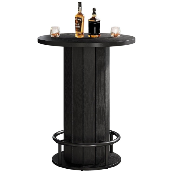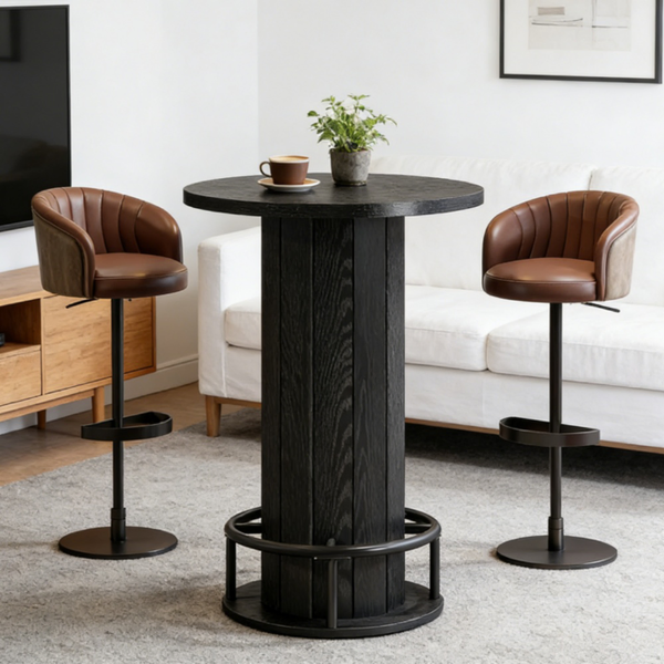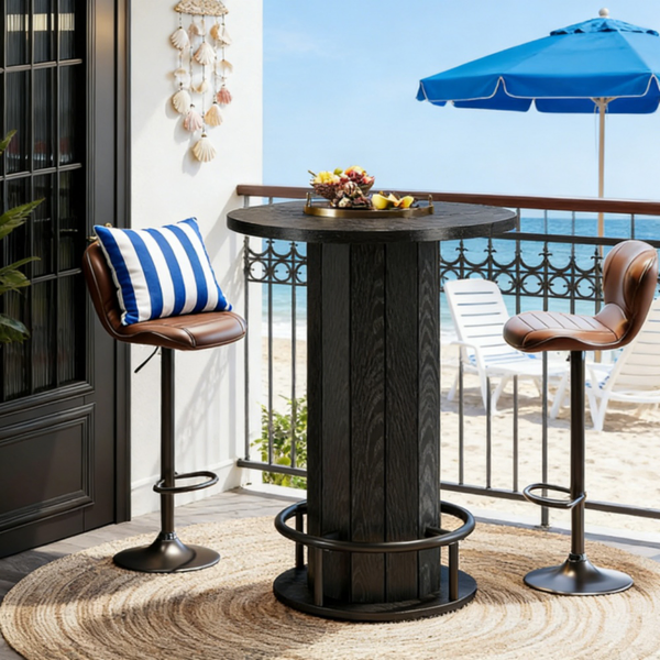 Farmhouse-Meets-Functionality - This mini bar table features a warm brown wood-grain top and a rounded wooden base, blending farmhouse charm with modern practicality.