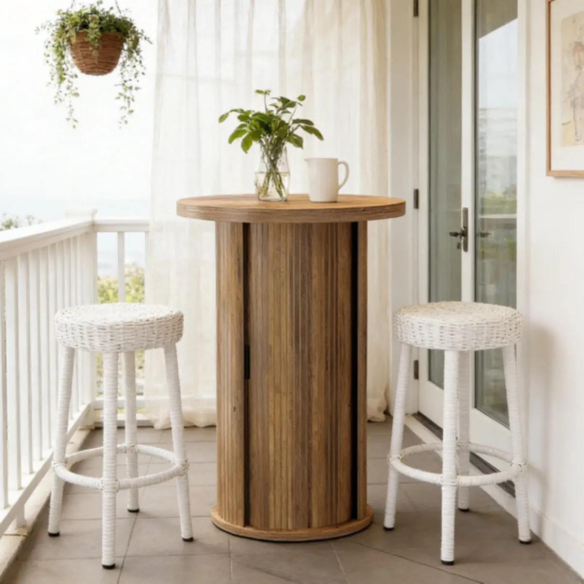 Sleek, Timeless Elegance - This bistro pub table boasts a graceful wood grain finish and refined fluted detailing. It's a sophisticated addition that seamlessly integrates with your home decor.