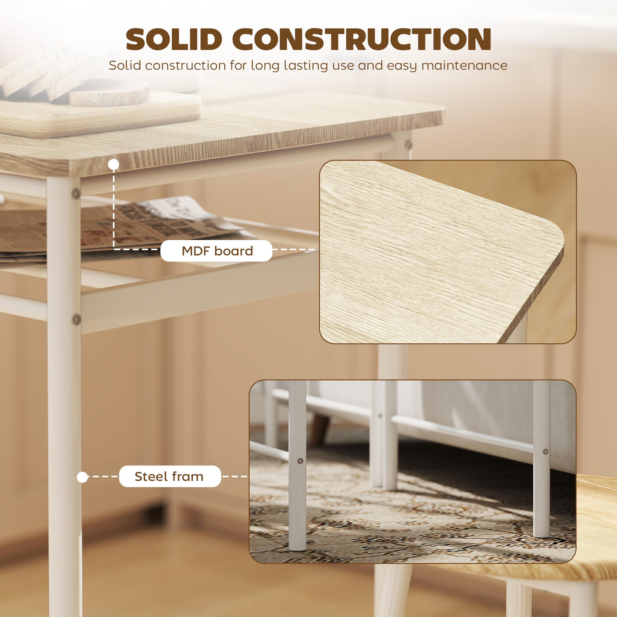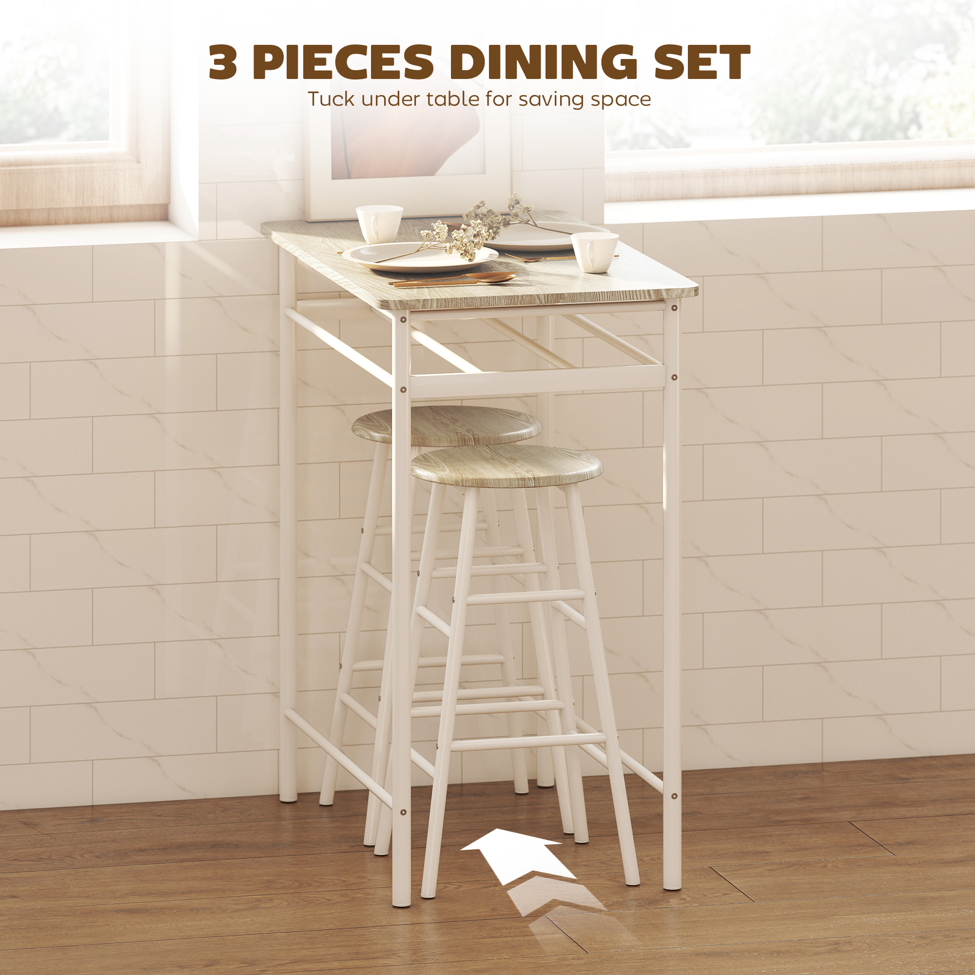 Relax with friends the right way - put this three-piece set from into action. It's formed of a bar table and two matching chairs, with the chairs tucking neatly underneath for a compact size when not in use. The thick and flat MDF table and seat tops can be reliably used everyday, with the steel frame ensuring a tough structure. A great addition for all home and small dining spaces.