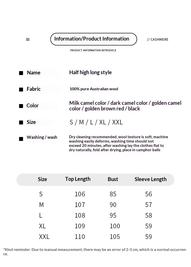 Colors: Light camel, dark camel, golden camel, golden brown-red, black