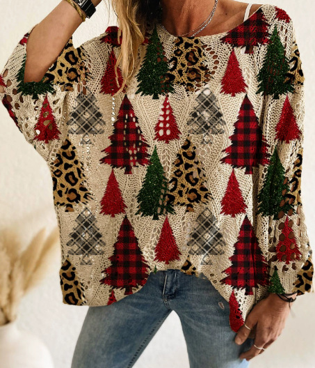 Bat Loose Off-shoulder Boat Neck Diamond Hollow-out Contrast Color Christmas Print Knitted Sweater