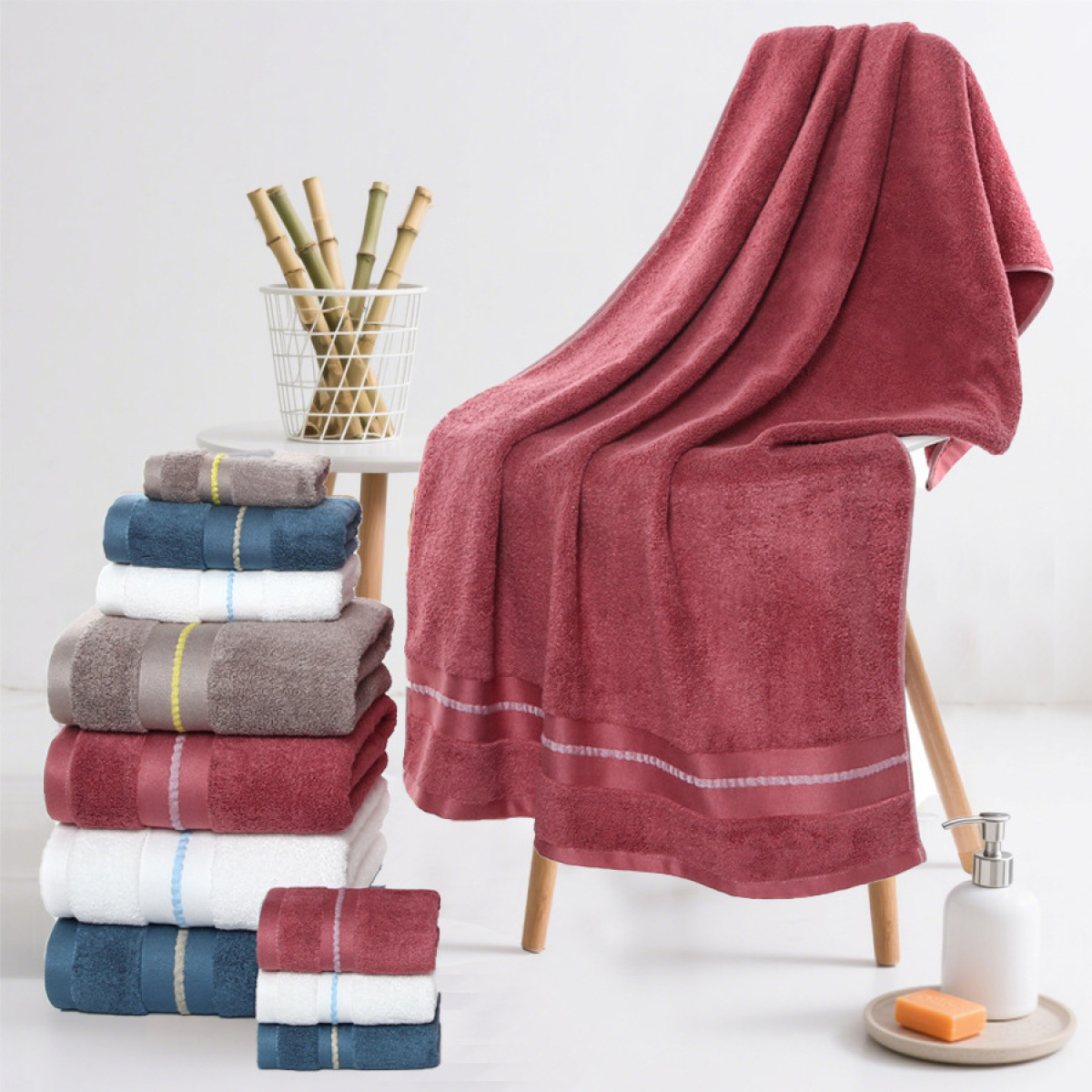 Color: Dark red bath towel, dark blue bath towel