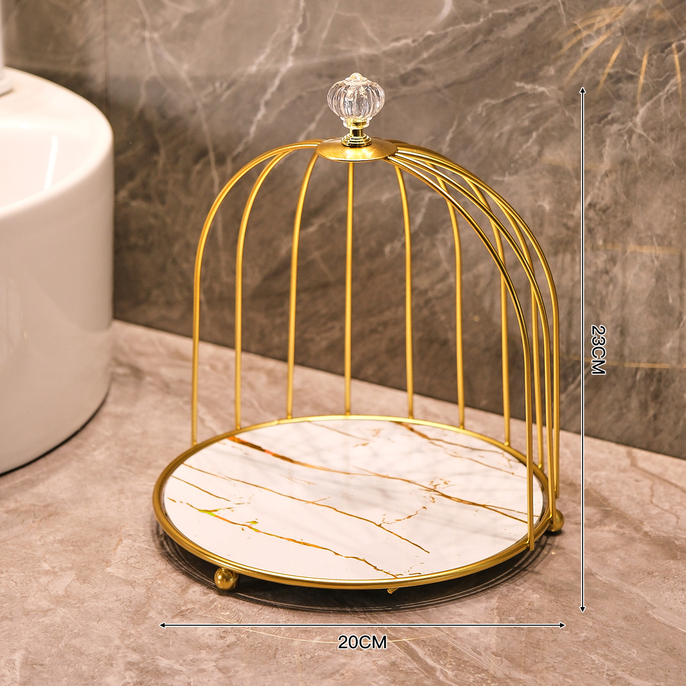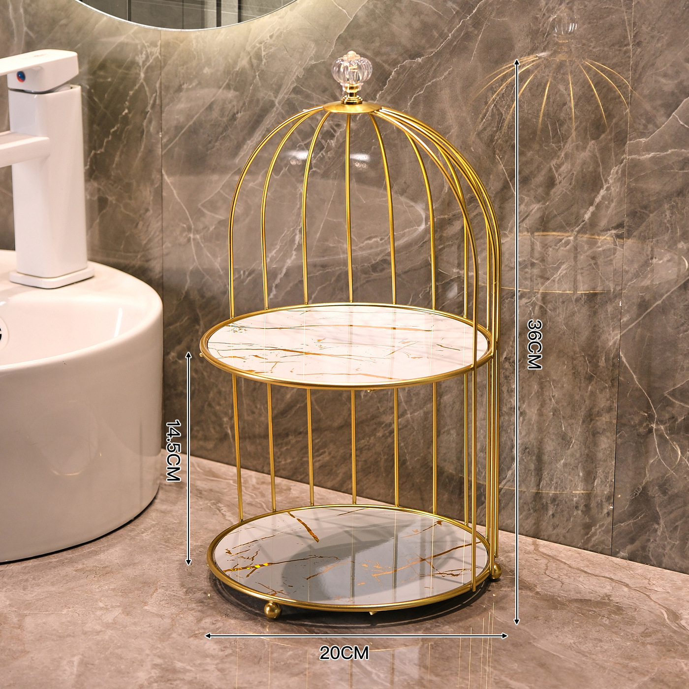 This elegant vintage metal bird cage organizer offers multi-tier storage for your vanity, bathroom, or washroom countertop. Designed to neatly hold makeup, skincare products, jewelry, and daily toiletries, it combines practical organization with decorative charm. The sturdy metal frame and layered shelves keep essentials tidy and within reach, making it both a functional storage solution and a stylish addition to your space.