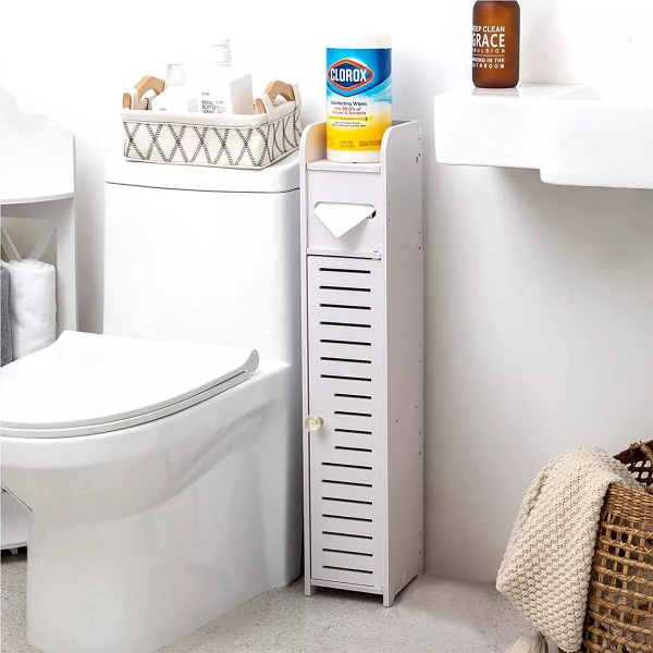 【LARGE STORAGE CAPACITY】The bathroom cabinet sized W6.7''x D6.7''xH32'', hold the regular toilet paper size 4.5''(L)x4.5''(W), can NOT fit mega rolls of toilet paper. This bathroom cabinet provides extra space to hold your daily essentials and keep your bathroom neat and organized.