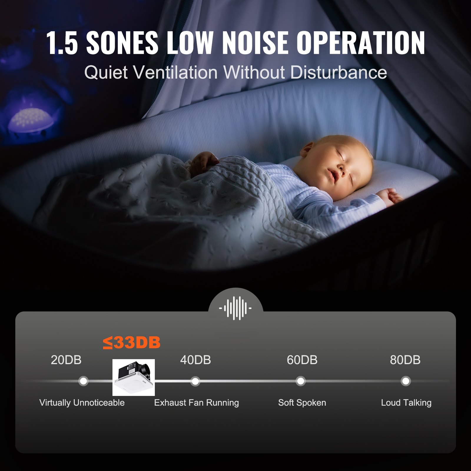 Quiet Operation: With a quiet airflow design and a lightweight PPFR plastic impeller, this exhaust fan minimizes noise. The high-quality motor ensures stable performance, with noise levels as low as 33 decibels (1.5 sones), providing a peaceful indoor condition.