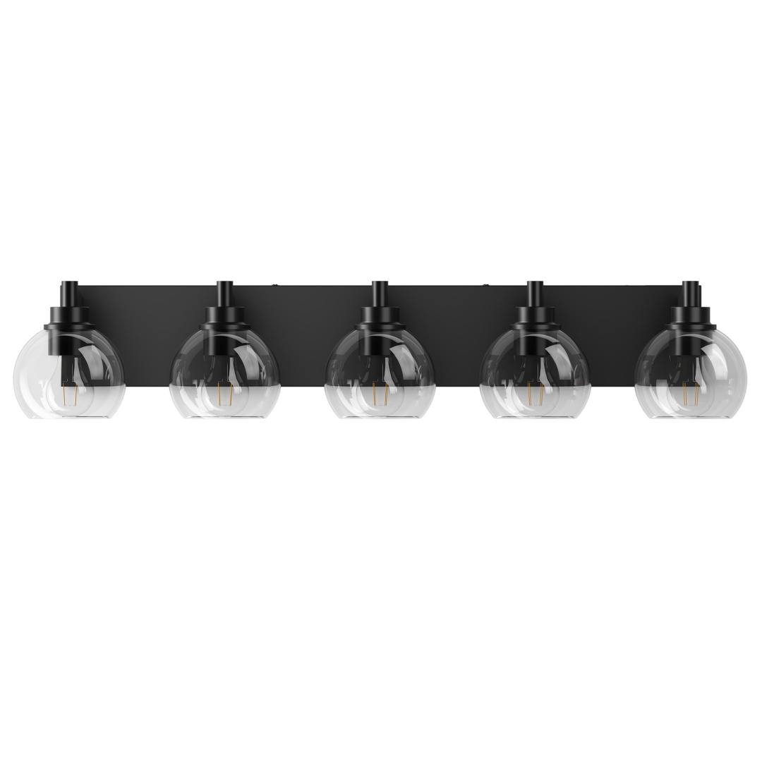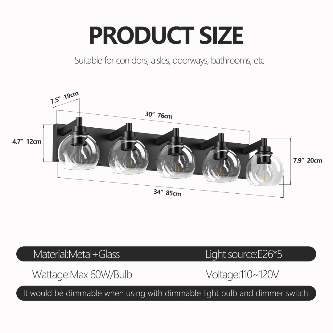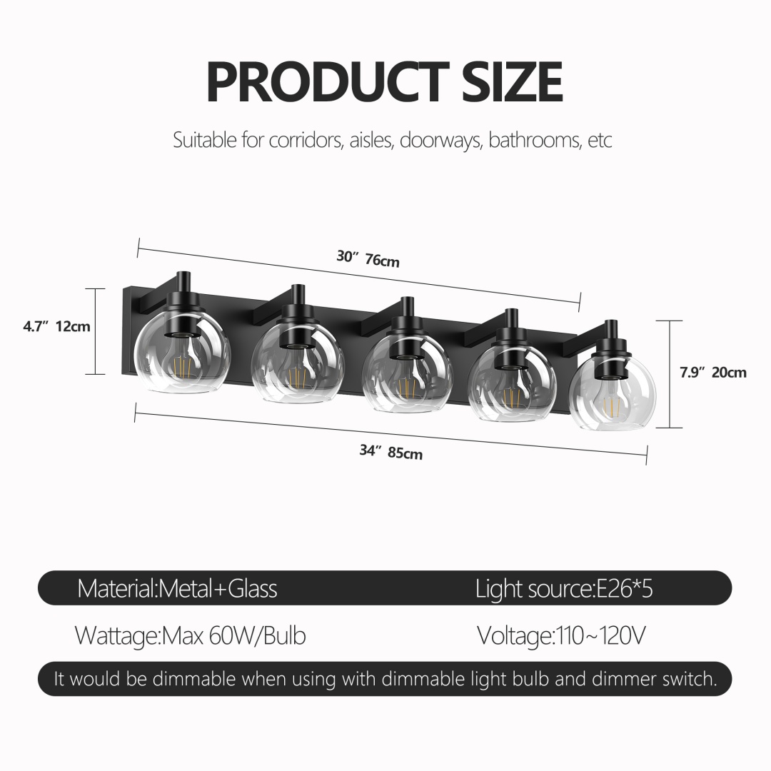 Elegant Design: The bathroom light fixtures has matte black finish, which is moisture-proof and rust-proof. Unlike other traditional design, our vanity light sport clean lines and clear glass globe shade, Simple and elegant light fixtures make your home warmer.Easy to Install: The design of vanity mirror light allows for this sconce to be installed in an upwards or downwards position. And This vanity lighting package included all mounting hardware, Just need to tighten the glass shade, connect the hardwired and fixed the light fixture.E26 Standard Sockets: The vanity lights for bathroom require 5 x E26 medium base bulbs (Max 60W for each light). This vanity lighting fixture can be used with dimmer bulbs for a dimming effect. (Note: bulbs not included.)Wide Application: This bathroom vanity light is suitable for mid-century, modern, classic, vintage and more styles. you can use this bathroom light in the bathroom vanity, kitchen, mirror cabinets, art display, powder room, makeup mirror cabinets, It can also be used as wall light.