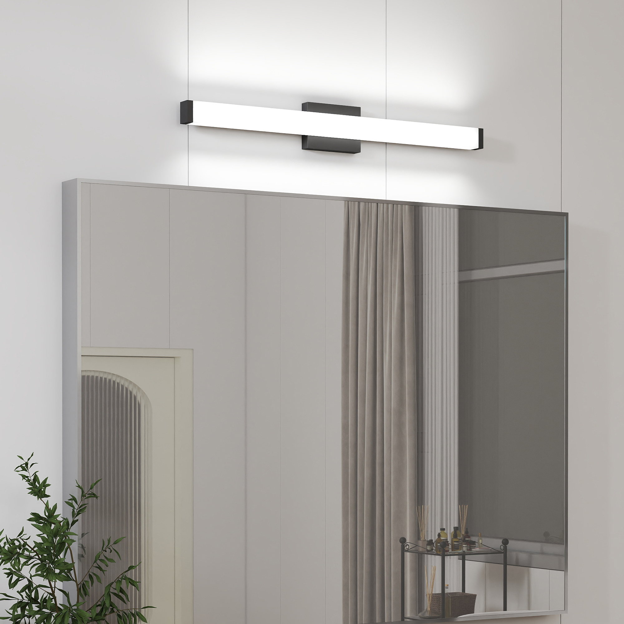 [Specification] The dimension of matte black vanity light is 32.7in*4.3in*2.6in(L*W*H). Its minimalist and stylish design makes it ideal for a bathroom mirror or medicine cabinet or sink.[Energy Saving] Modern bathroom light fixtures offer energy efficiency at its best.The 18 Watt bathroom wall light fixture can achieve the same brightness as a 90W halogen bulb, and can reduce heat output and save over 90% on the electricity bill of lighting.[High Quality] This light fixture bathroom adds an extremely modern vibe with matte balck metal hardware and solid white acrylic shade. Both ends of the light fixture are sealed against moisture to prevent water vapor and mosquitoes from entering. Safe to use and easy to clean.[Easy & Quick Installation] This small vanity bathroom light is pre-assembled, only need to mount onto the junction box on the wall. It can be installed horizontally above mirror or vertically on both sides of mirror.