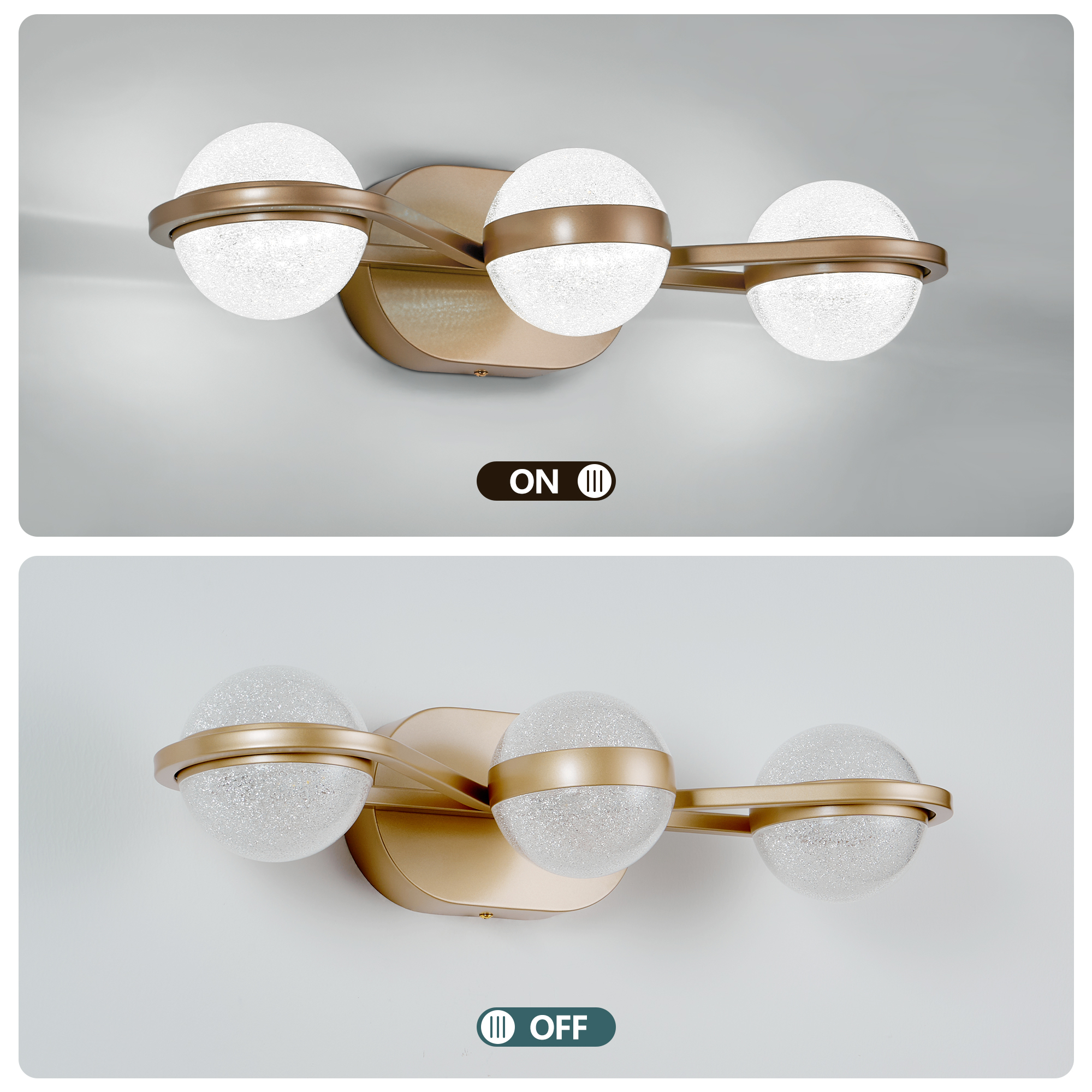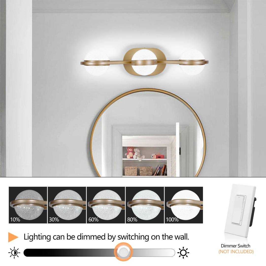 Modern and simple design:3 Lights bathroom Vanity Lighting. Modern and simple style design, suitable for your bathroom, mirror cabinets, powder room, bedroom and living room etc. Modern vanity light brightens your living instantly.High quality construction: High-quality Brushed Gold Frame, with advanced electroplate craft and sealing technology, dust-proof, fog-proof, anti-corrosion, and moisture-proof, is suitable for humid environment.Energy saving technology: Creates stable and efficient light. LED technology saves up to 80% electricity compare to conventional light bulbs and lifespan up to 50,000hours.Easy to install: With easy-to-follow instructions and all necessary hardware included, anyone can install these lights quickly and hassle-free.