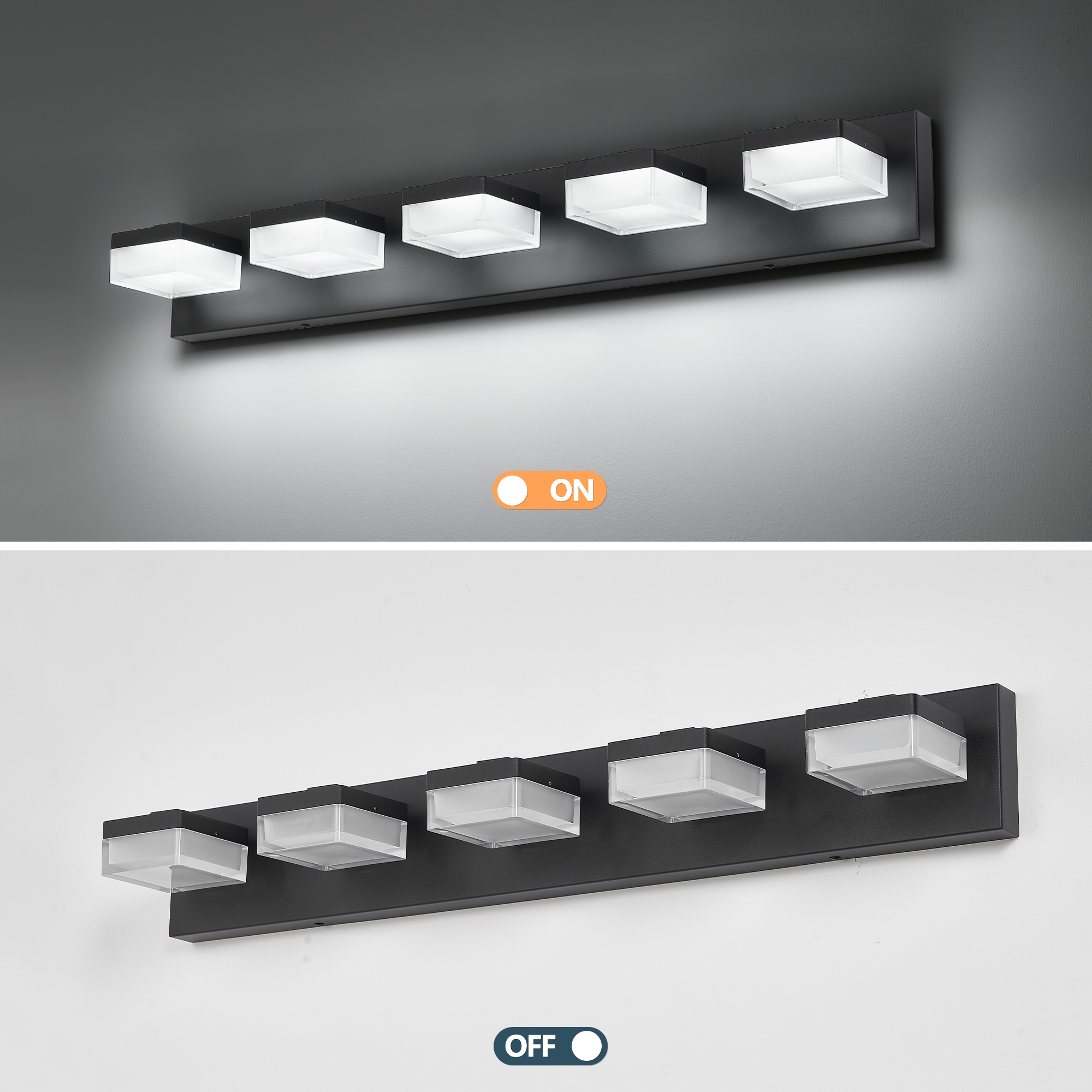 1.Exclusive Original Design: Brings More Brilliance to Your Life, Simple and Luxurious Design, High-end Quality, Highlights Your Taste.2.EASY TO INSTALL: No switch or cord on the light. JUST Connect to the reserved wire directly,Suitable US junction box standard.3.ENERGY SAVING: 30W LED Vanity Lights / White Light. Although only 30W, but he offers brightness more than ordinary 80W bulbs4.HIGH QUALITY MATERIAL: Matte Black Finished Metal with White Solid Acrylic Shade, Modern and Shine Your Room. Thick Acrylic Shade, soften lighting and care for eyes health.