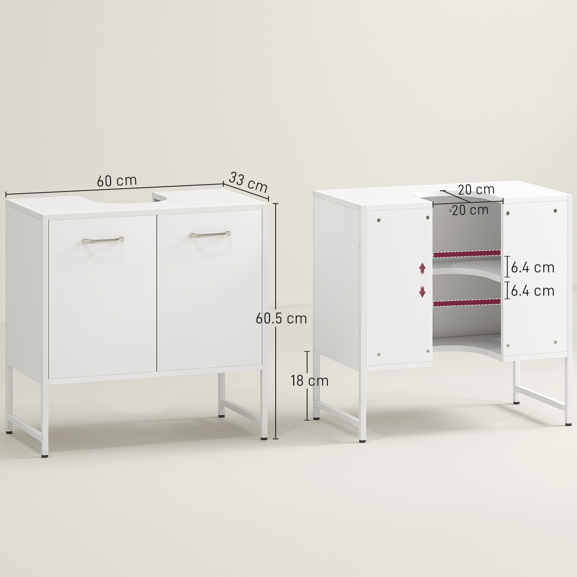 Transform your bathroom with the under sink bathroom cabinet from , cleverly designed to fit around most basins with its 20 x 20 cm U-shaped slots. Enjoy the quiet of soft-close hinges that prevent door slamming and optimise your space with adjustable three-level shelving behind double doors. The under sink storage cabinet is a great solution for any bathroom.