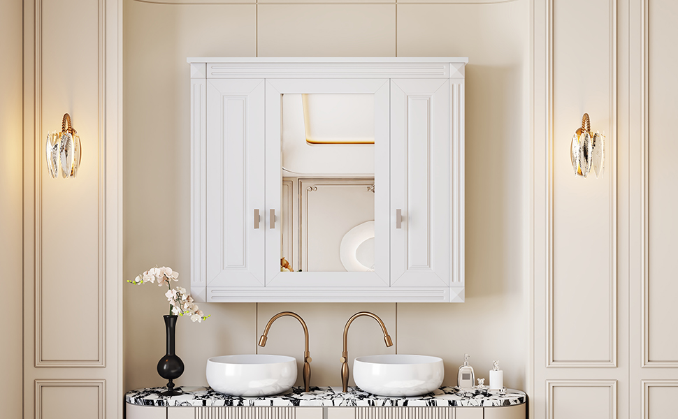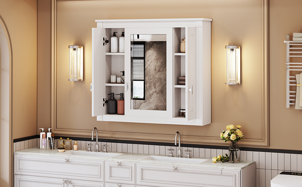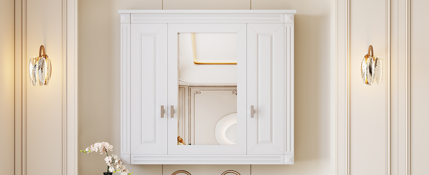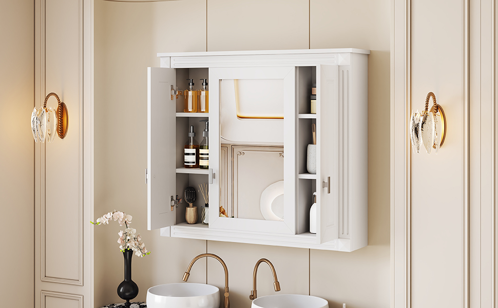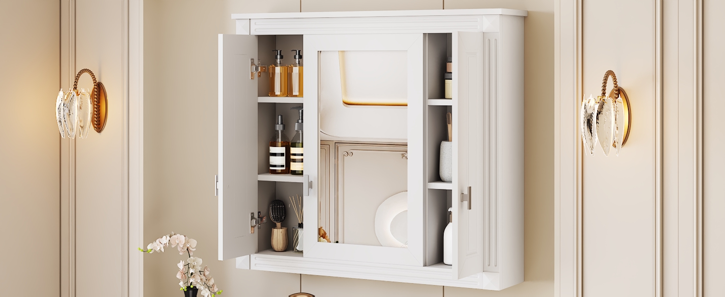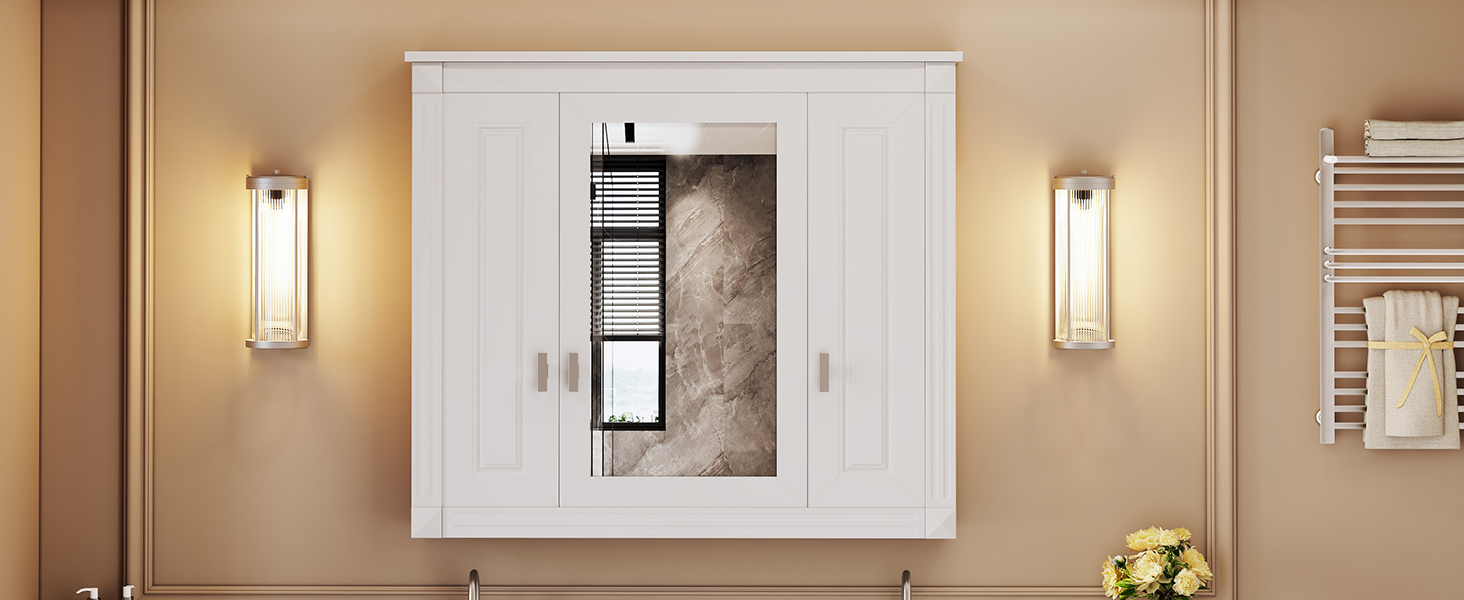 This wall-mounted mirror cabinet combines high-quality MDF panels and high-definition mirrors to create a sturdy and beautiful home storage solution. The exquisite mirror provides clear reflections, making your daily grooming more convenient. The unique design combines hidden storage and open shelves to meet different storage needs. Three large storage cabinets can easily hide personal items and keep the space neat and organized; three layers of adjustable shelves provide flexible storage space for various items to adapt to your changing needs. Whether in the bathroom, bedroom or living room, this mirror cabinet can be perfectly integrated, adding fashion and practicality to your home.