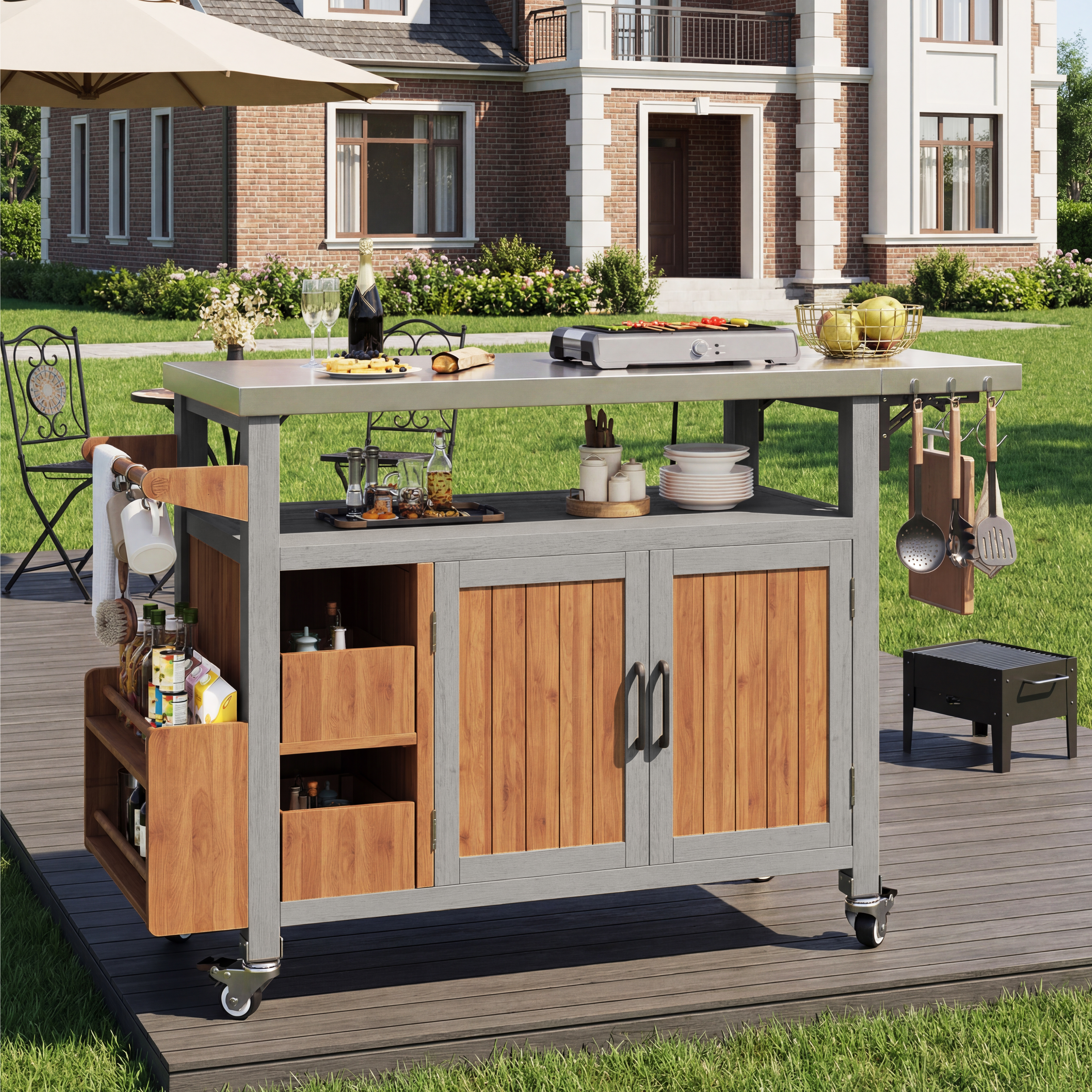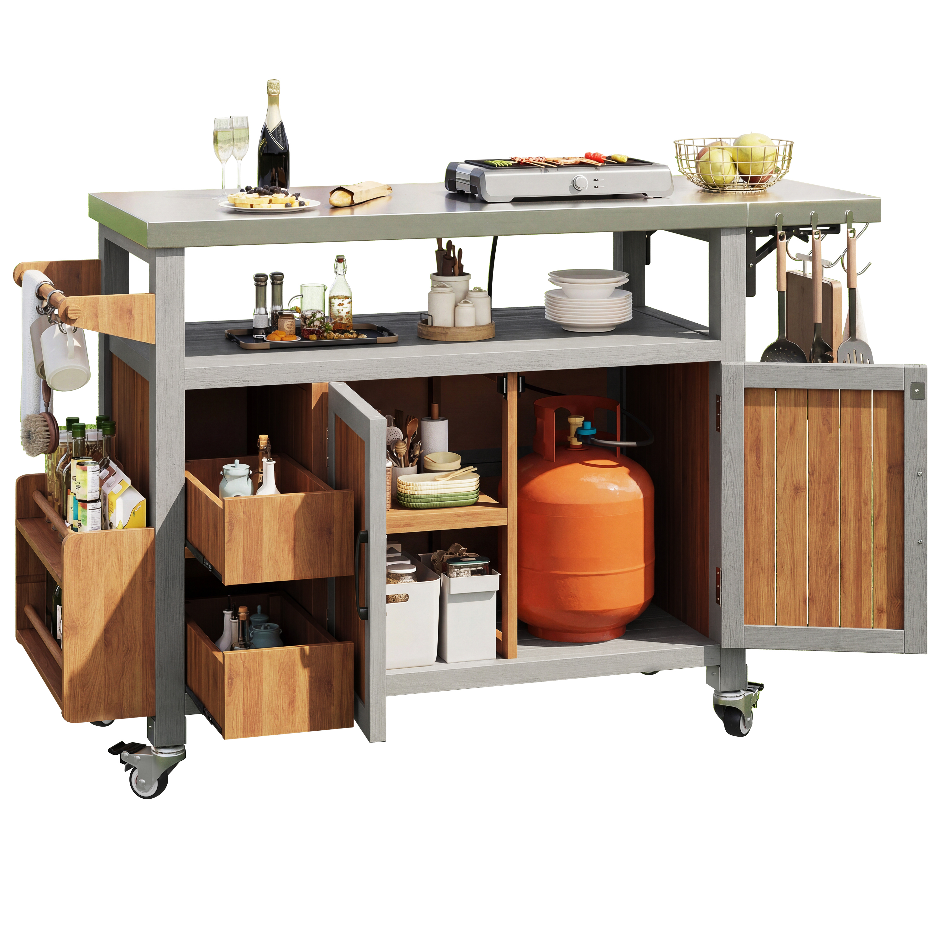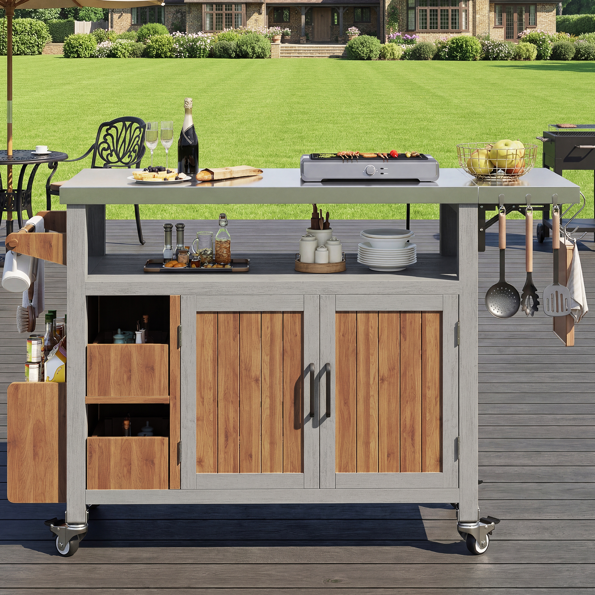 Product Name:BBQ side table, mobile garden cabinet, weatherproof, stainless steel worktop, outdoor sideboard, serving trolley with pull-out side shelf, 3 hooks, shelf for snacks and spices, solid wood