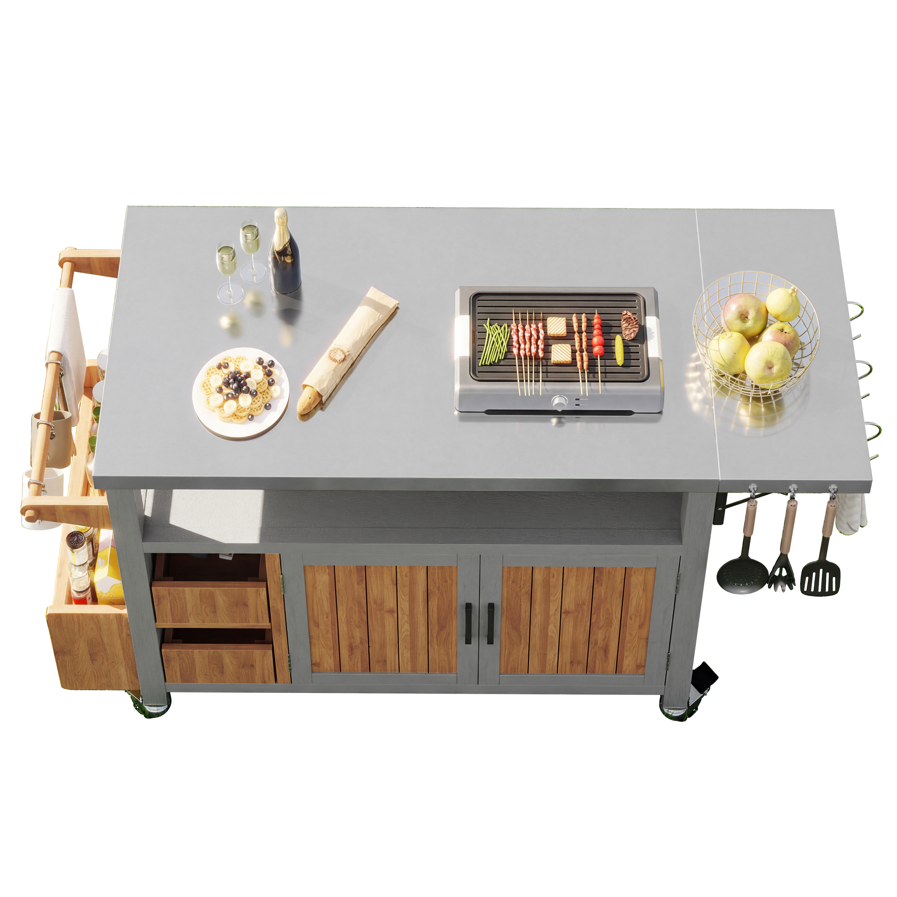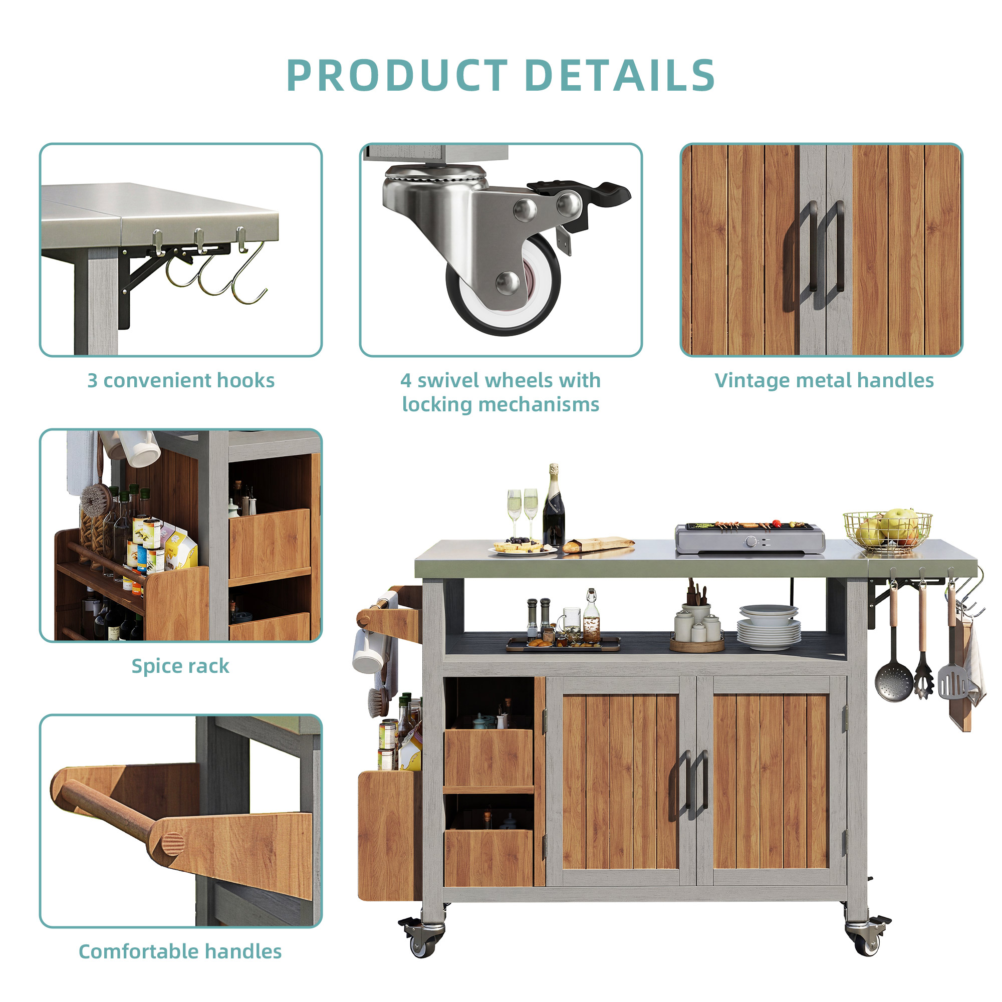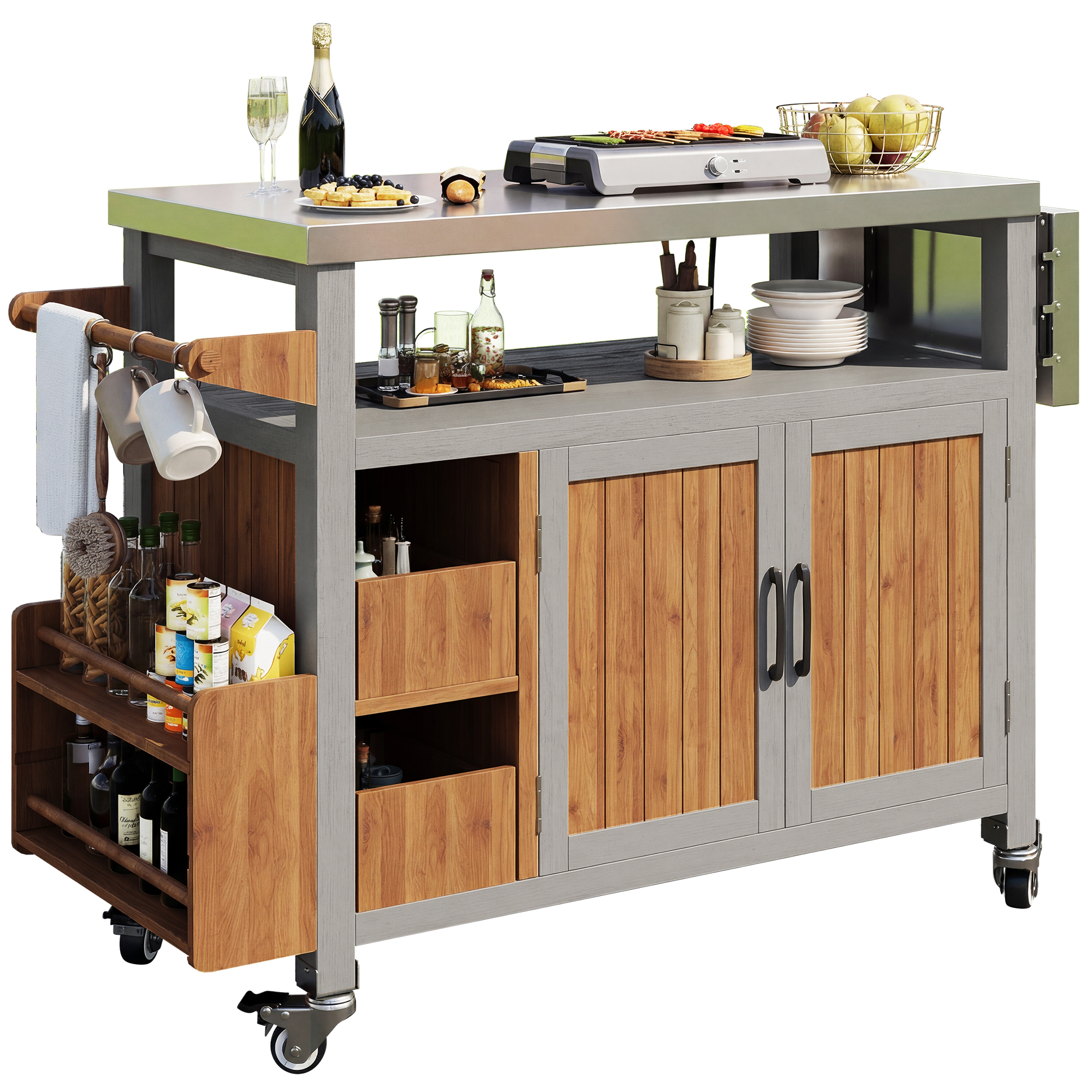 Product Name:BBQ side table, mobile garden cabinet, weatherproof, stainless steel worktop, outdoor sideboard, serving trolley with pull-out side shelf, 3 hooks, shelf for snacks and spices, solid wood